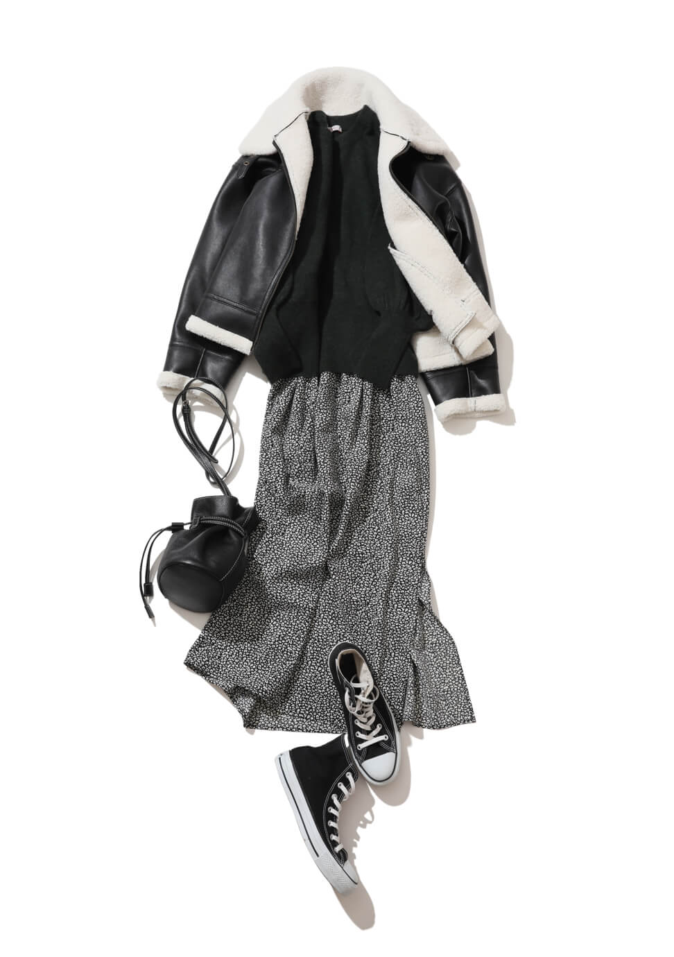 シンプルながら抜群のお洒落感を醸し出せるオールブラックコーデは、鮮度をあげるのにうってつけ。モノトーンのレオパードスカートにニット、フェイクレザーのフライトジャケットを羽織って、一筋縄でいかないスタイリングにアップデートして。足元はブーツだと重たくなるから、コンバースのハイカットでハズすのが良い塩梅。