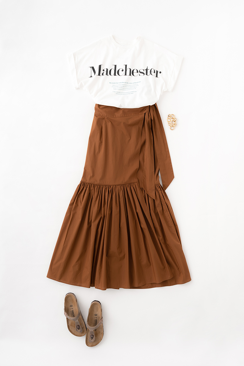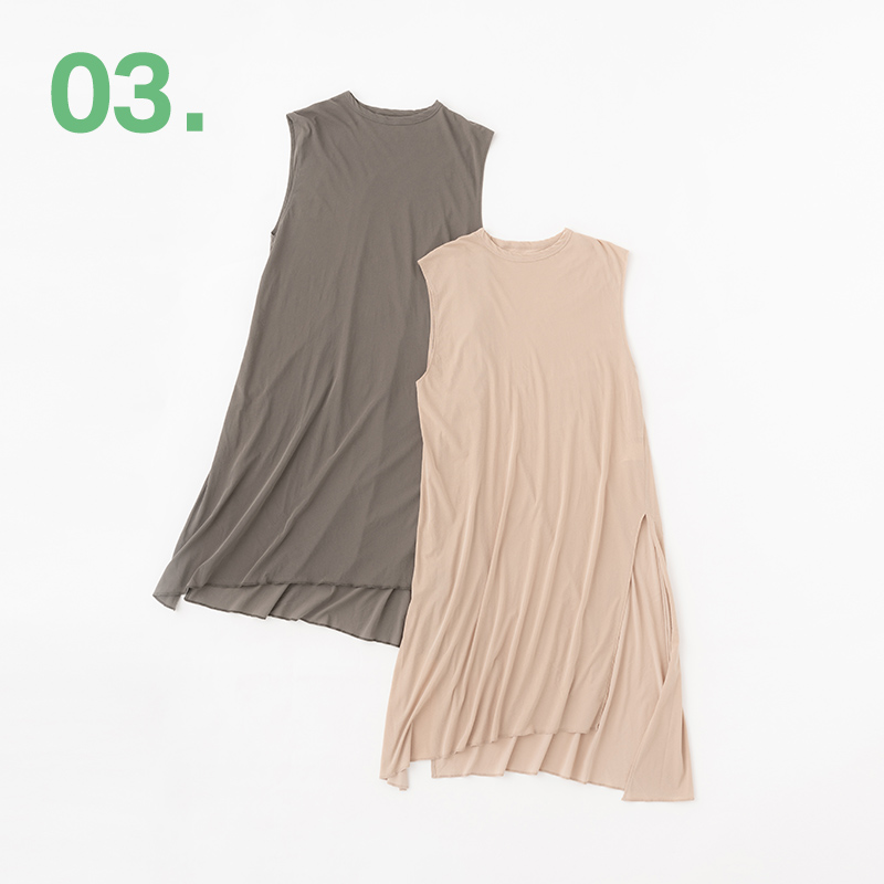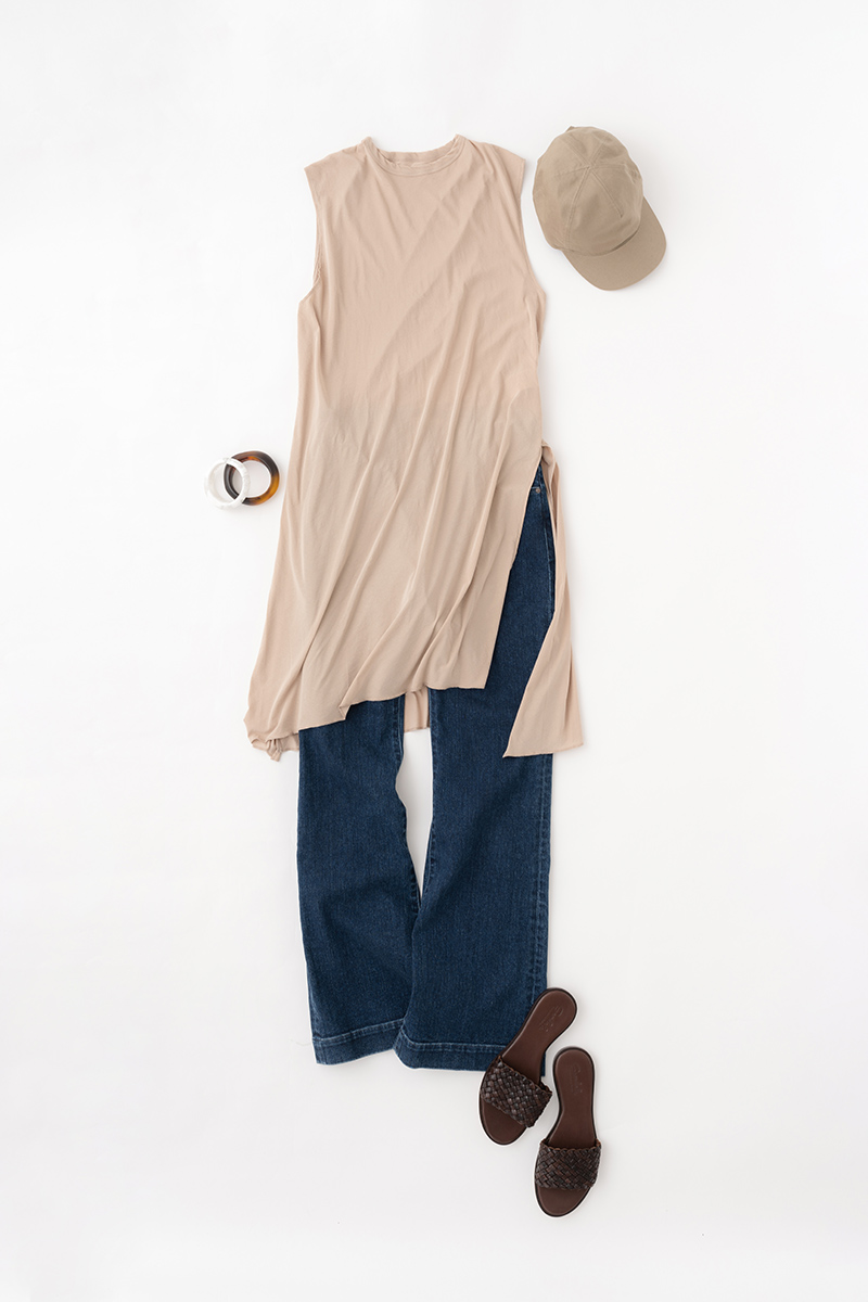 手に取ると驚くほど薄く上質な素材で軽やかな印象を与えてくれるチュニック。いつものTシャツスタイルと一味違う、旬なスタイリングを楽しみたい。