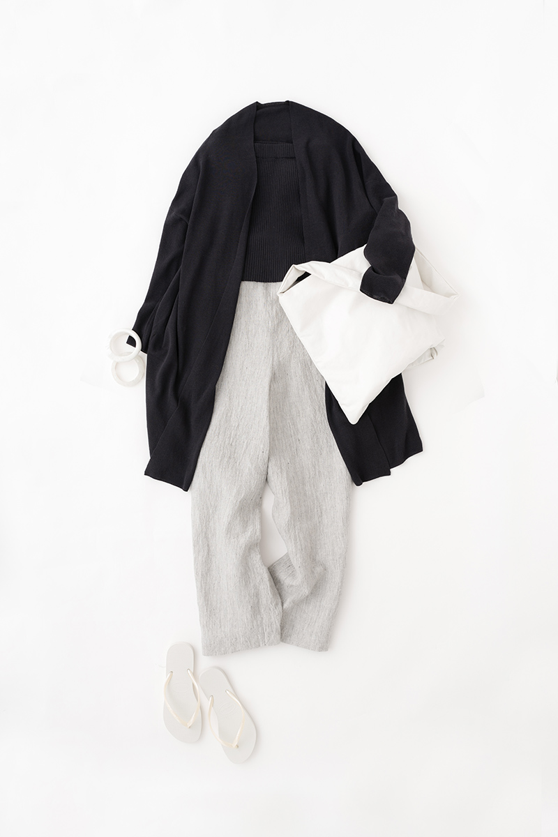 リネンパンツをクリーンに着たい、そんな時はモノトーンでまとめる。冷房対策もバッチリなこのスタイルでショッピングへ。