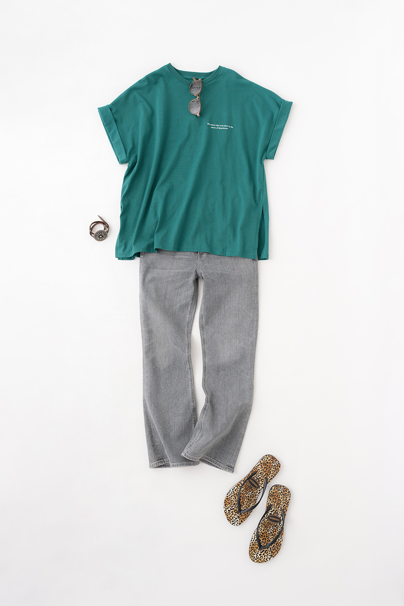 グリーン×グレーデニムの掛け合わせで大人カジュアルが完成。楽に着れて様になるこの合わせは困った時に頼りになる鉄板コーデに。