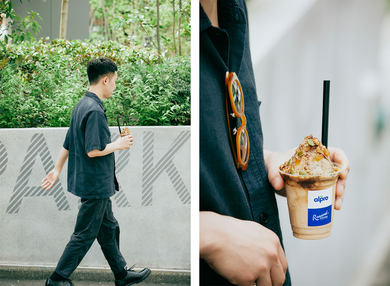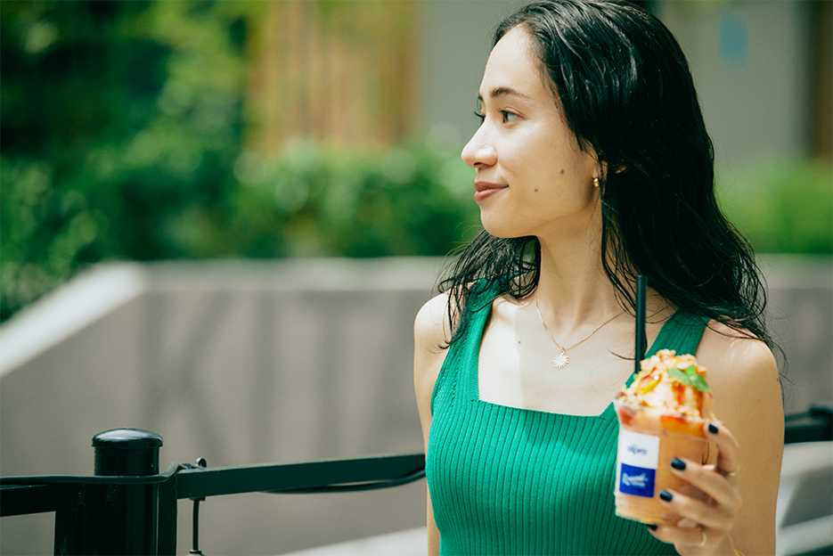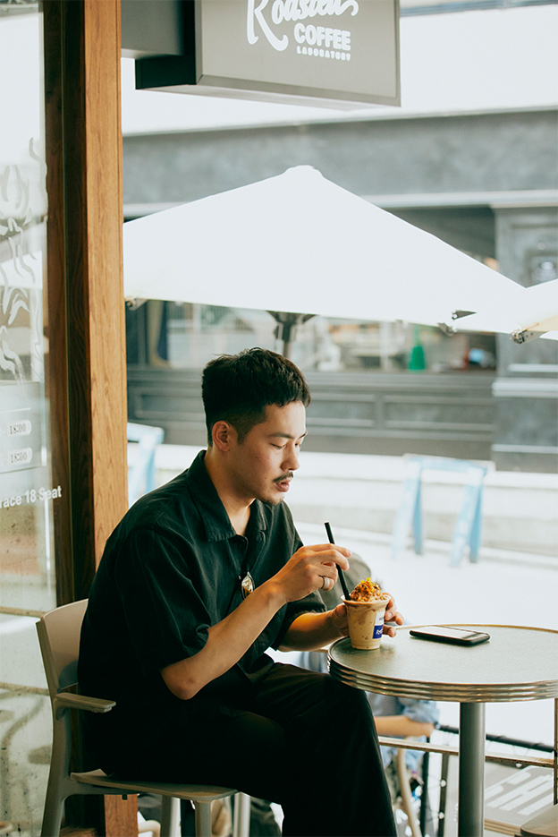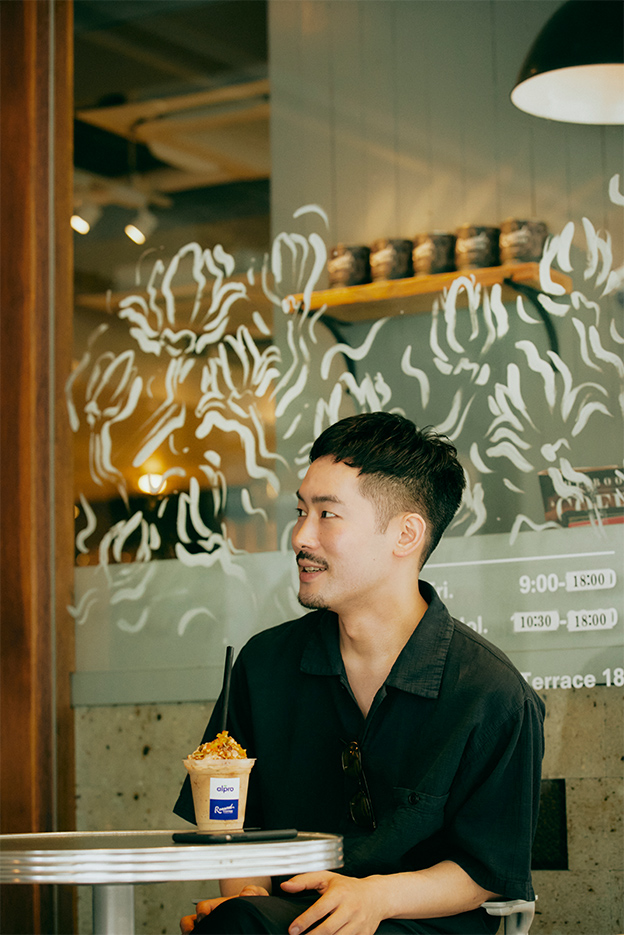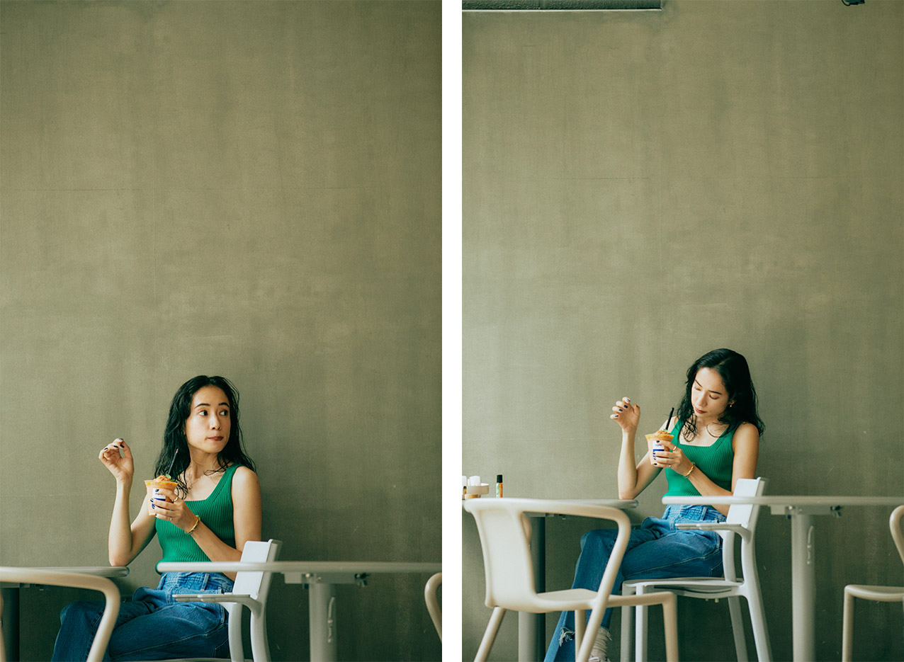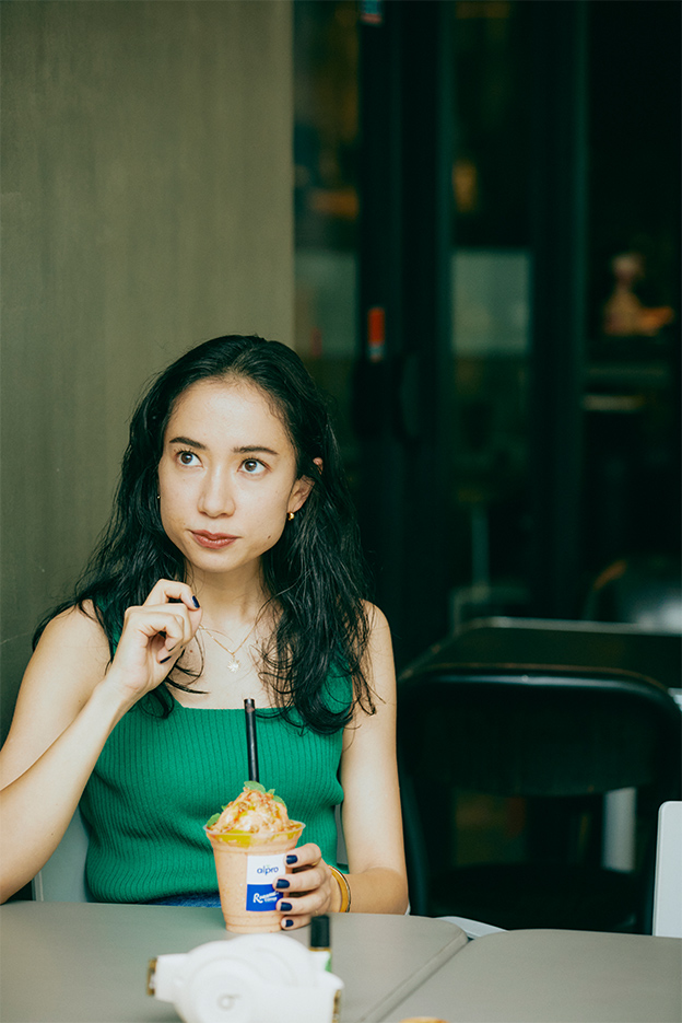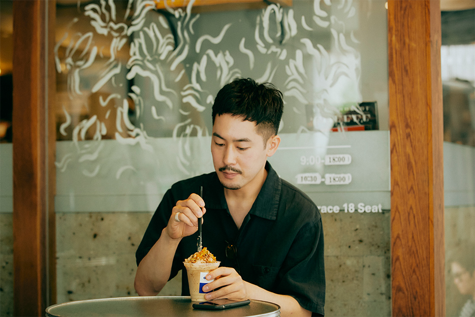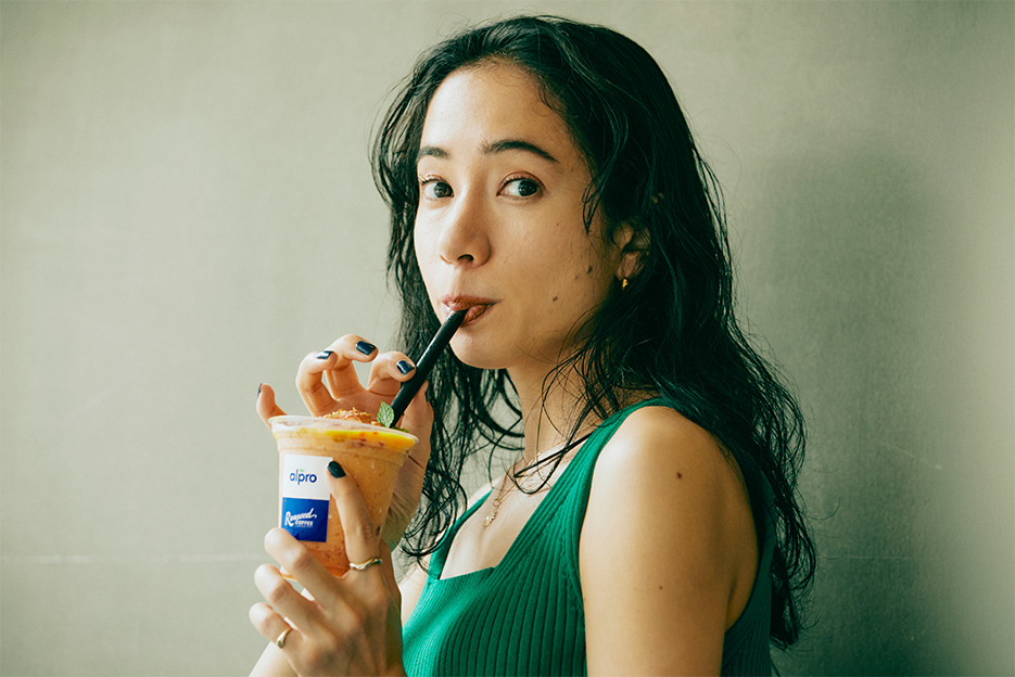 エスプレッソの風味がかなりしっかり効いてますね。甘さは、矛盾するようだけど、控えめで濃厚。いわゆるスムージーとは密度が違う感じがする。19歳の頃からしばらくのあいだ、コーヒーショップで働いていた時期があるんです。いまでもコーヒー器具は一式持っていて、家で淹れたりしています。そういうときに飲むのはブラックがほとんどですが、たまにこういう甘いのを飲みたくなるんですよね。