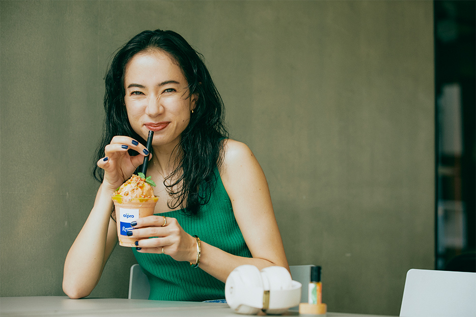 それもありますが、もともとはアメリカ出身のお父さんが詳しくて。日本ではまだソイミルクすらポピュラーじゃない時から、ディカフェのコーヒーやノンアルコールビールなど、いちはやく取り入れていたんです。おかげでわたしも、小さい頃からずっとソイミルクを飲んで育ちました。日本でも、最近はオーガニックや植物性の食材など、選択肢が徐々に増えていますよね。それこそ今回日本に帰ってきたとき、テレビでALPROのCMが流れているのを見て、お父さんと感動していました!