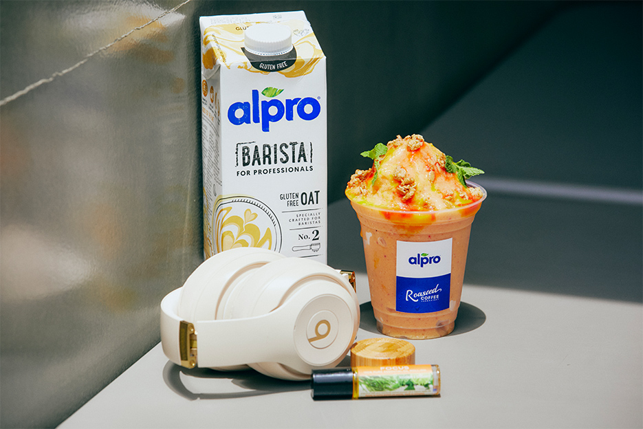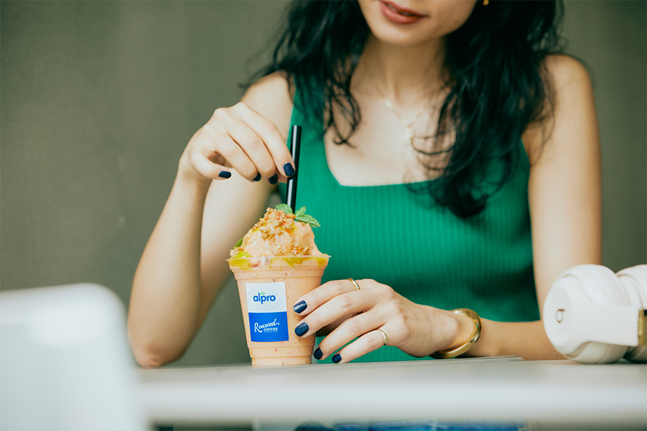 −今回ベイカーさんには、「ヴィーガン マンゴーストロベリー オーバーナイトオーツスムージー」を飲んでいただきました。ALPROのオーツミルクとオーバーナイトオーツをベースに、エキゾチックなマンゴーやバナナ、そしてストロベリーの甘酸っぱさを加えたヴィーガンドリンクです!