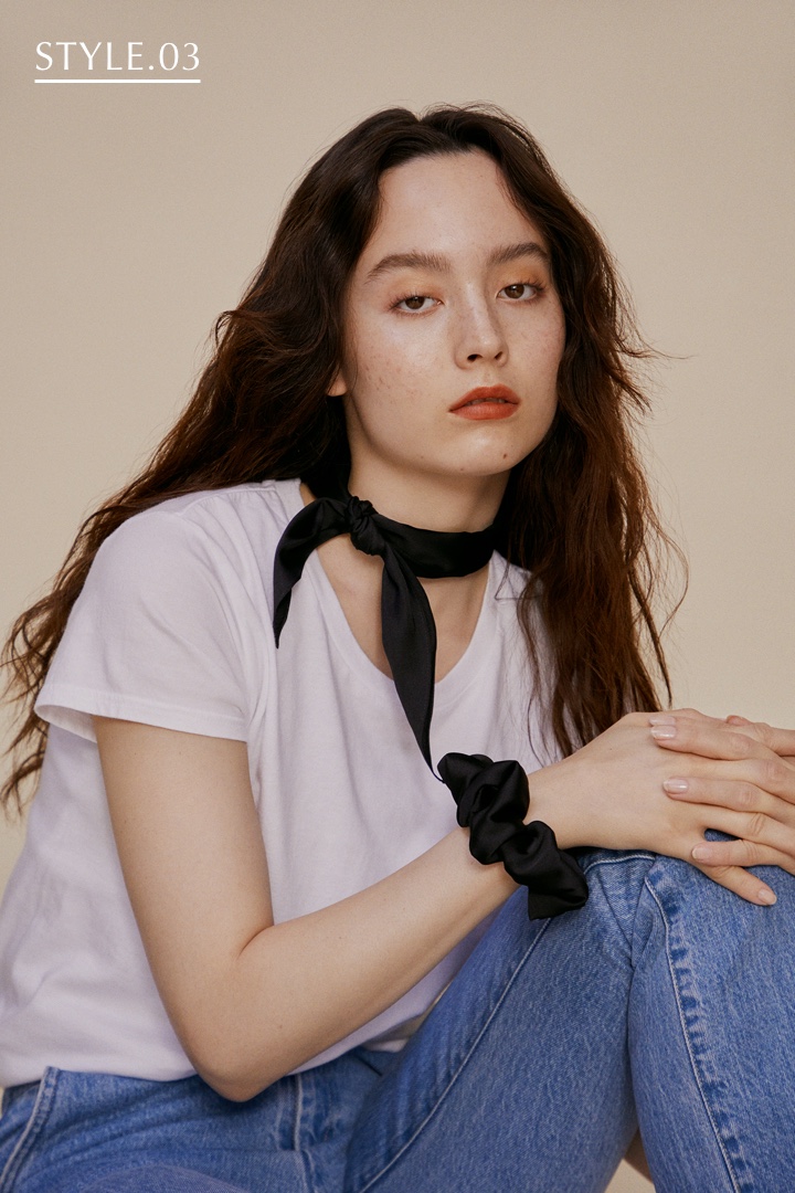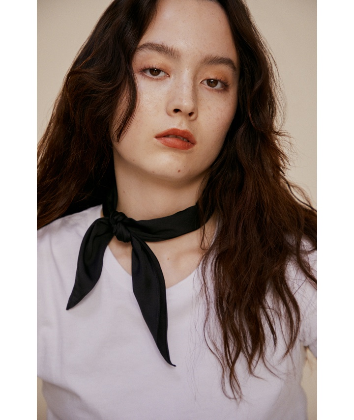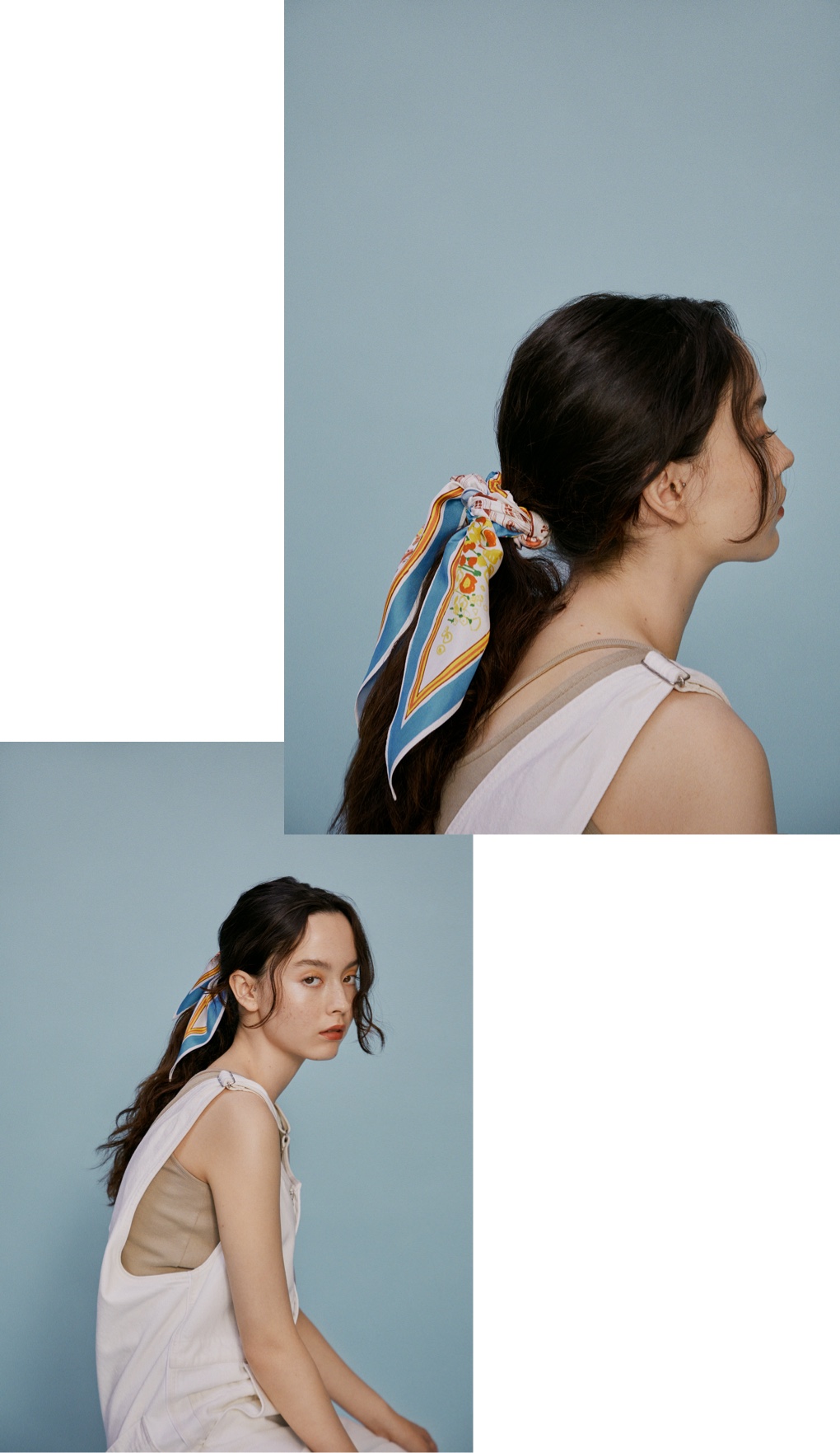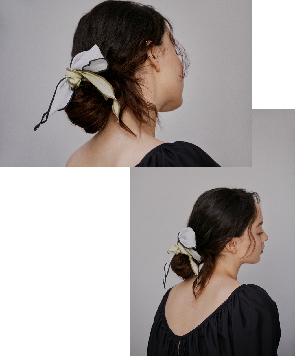 シュシュ&スカーフのセットなので、シルクスカーフとして首元にあしらうのもオススメ。
