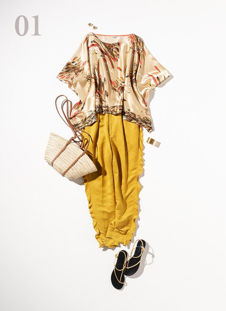カラーアイテムって難しそうな意識がある方も多いのかな。そういうときは、顔から離れた場所からトライするといいかも。使ってみてもらいたいのは断然、黄色。日本人には肌馴染みがいいから実は取り入れやすいの。落ち着いたマスタードはキャメルやベージュの延長上で考えればうまくいくから、今日は同じトーンの柄物を。