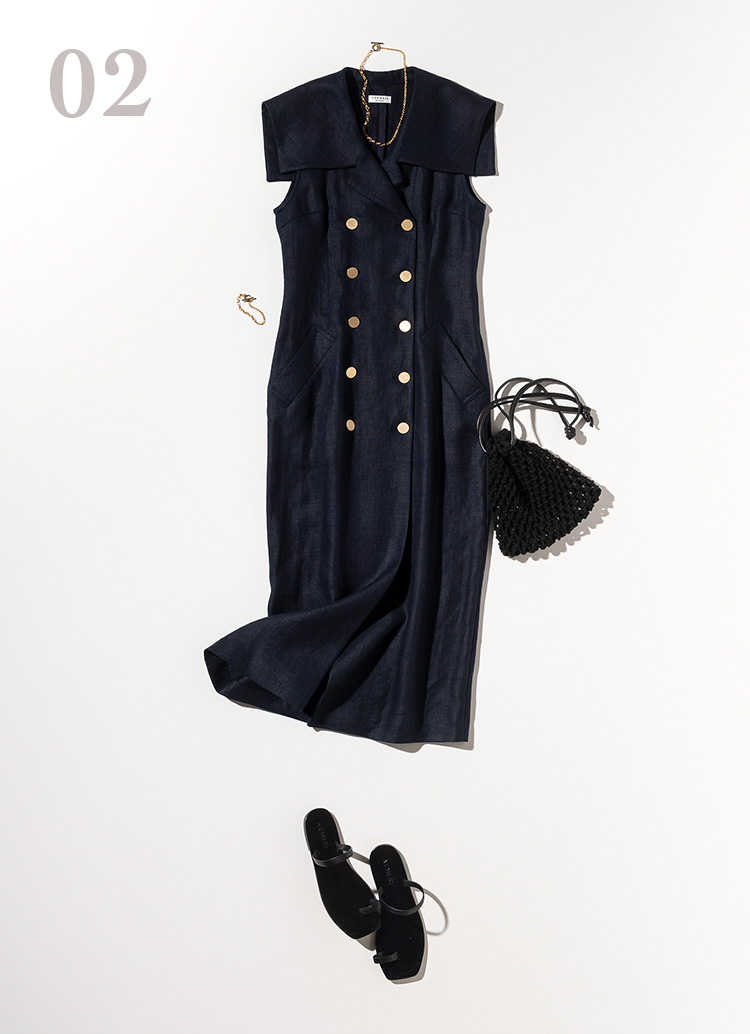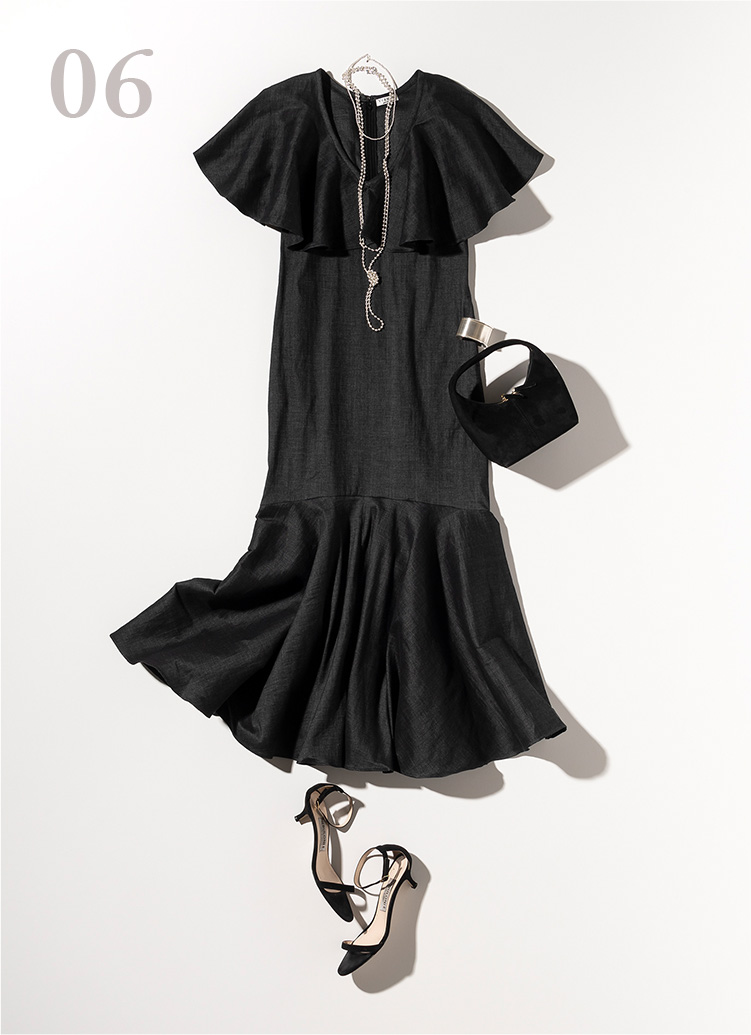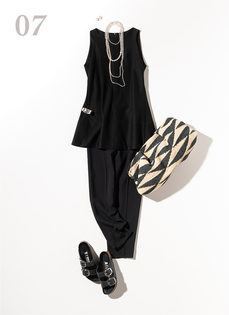 『黒』は素材で表情がガラリと変わる振り幅の広い色。ノースリーブなら肩の肌感も含めてみせたいから、腕にはきちんとクリームをつけて艶を感じさせながら潔く一枚で。夏の光とマットなブラックとのコントラストが涼し気な空気を作ってくれて知的でエレガントな印象にしてくれる。