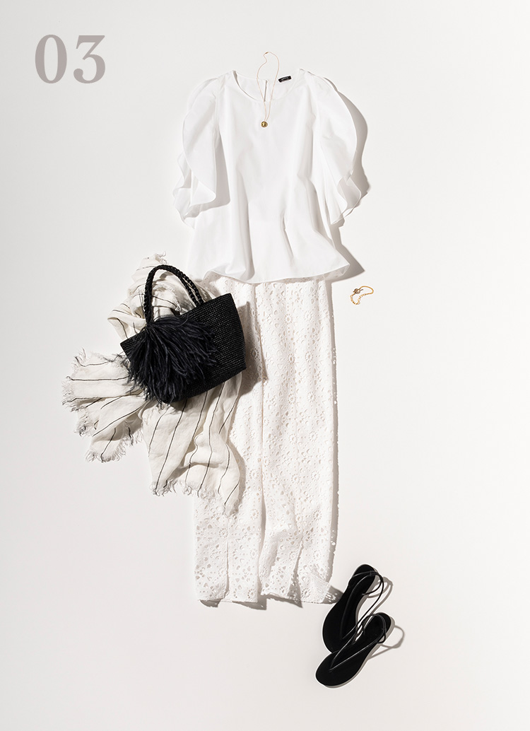 フェミニン気分のレースボトムもオールホワイトでコーディネートすることで凛とした強さがでて着ていても気持ちいい。小物には黒を配することで全体をモノトーンにするとメリハリがでて、目の覚めるようなシャープさを加えてくれる。