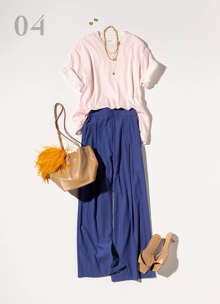 赤みを含んだパープルがきれいなパンツには、白Tでももちろんいいんだけど、今日は薄いピンクを重ねてもうひとひねり。そうすると、ボーイッシュなショートヘアの人は少しフェミニンに、スウィートなムードの人は少しマニッシュに。着る人を逆サイドに連れていってくれるような、そんな空気をもつスタイル。