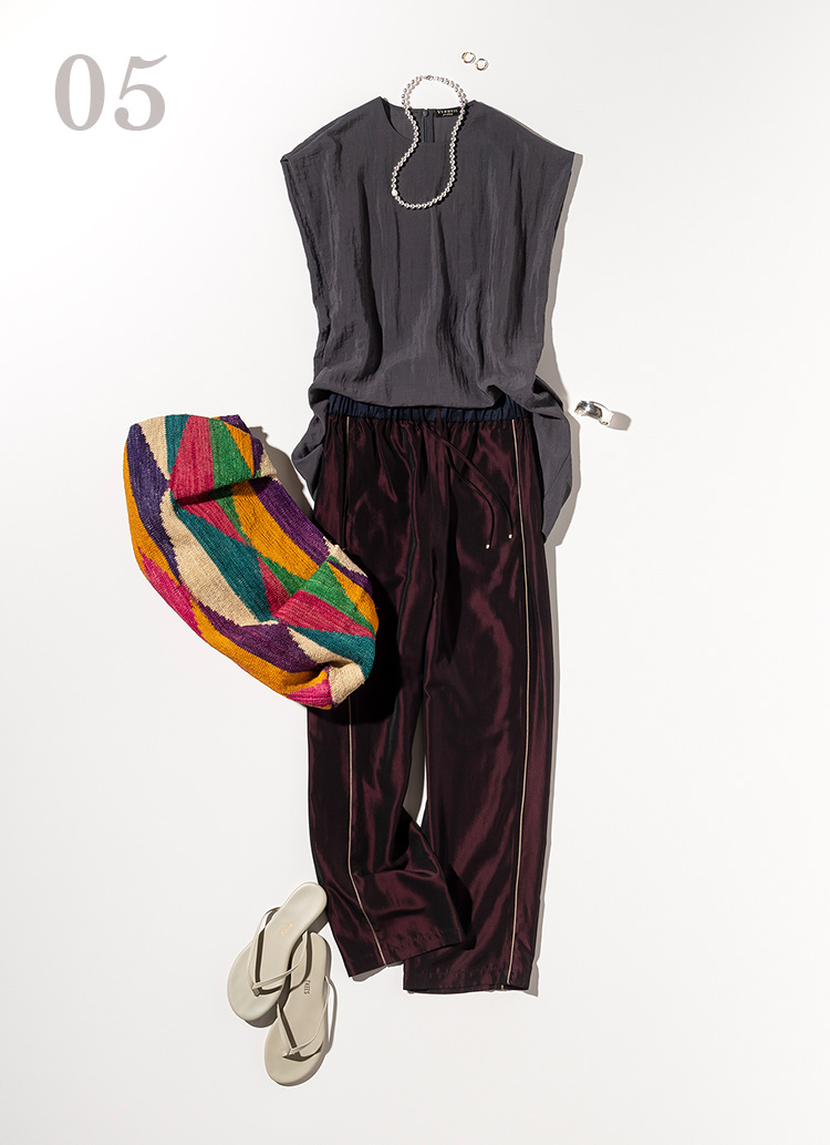 グレーとボルドーの配色なんだけど、このグレーには赤みが入っていて実はグレーと同トーンで相性がいいの。イージーパンツとの合わせだけど、パンツに光沢感があるからシルバー×パールネックレスをプラスすれば不思議とエレガントな雰囲気に。人に緊張感を与えないお出かけ服って、これから必要な時代感だよね。
