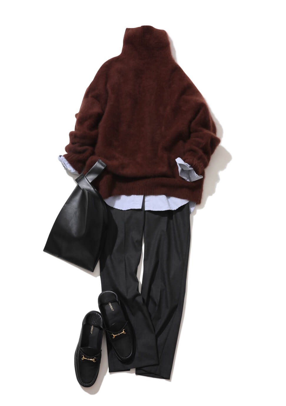 ハンサムにまとめたいときのワンツーコーデといえば、タートルネックニットとスラックスのコンビネーション。単調な印象にならないのは、表情豊かなふわふわのモヘアニットのおかげ。深みのあるチョコ色もグッド。さらに間にシャツを挟んで、プレッピーなニュアンスでリズムを加えて。黒ローファー&バッグでモードな要素もプラス。