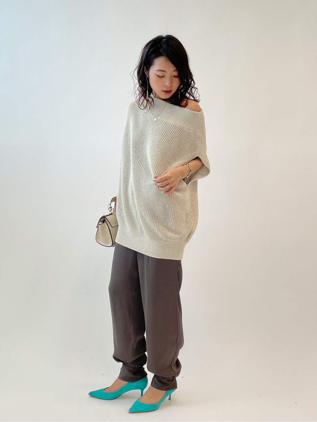 ゆるめのニットプルオーバーは、オフショルで肌見せ。