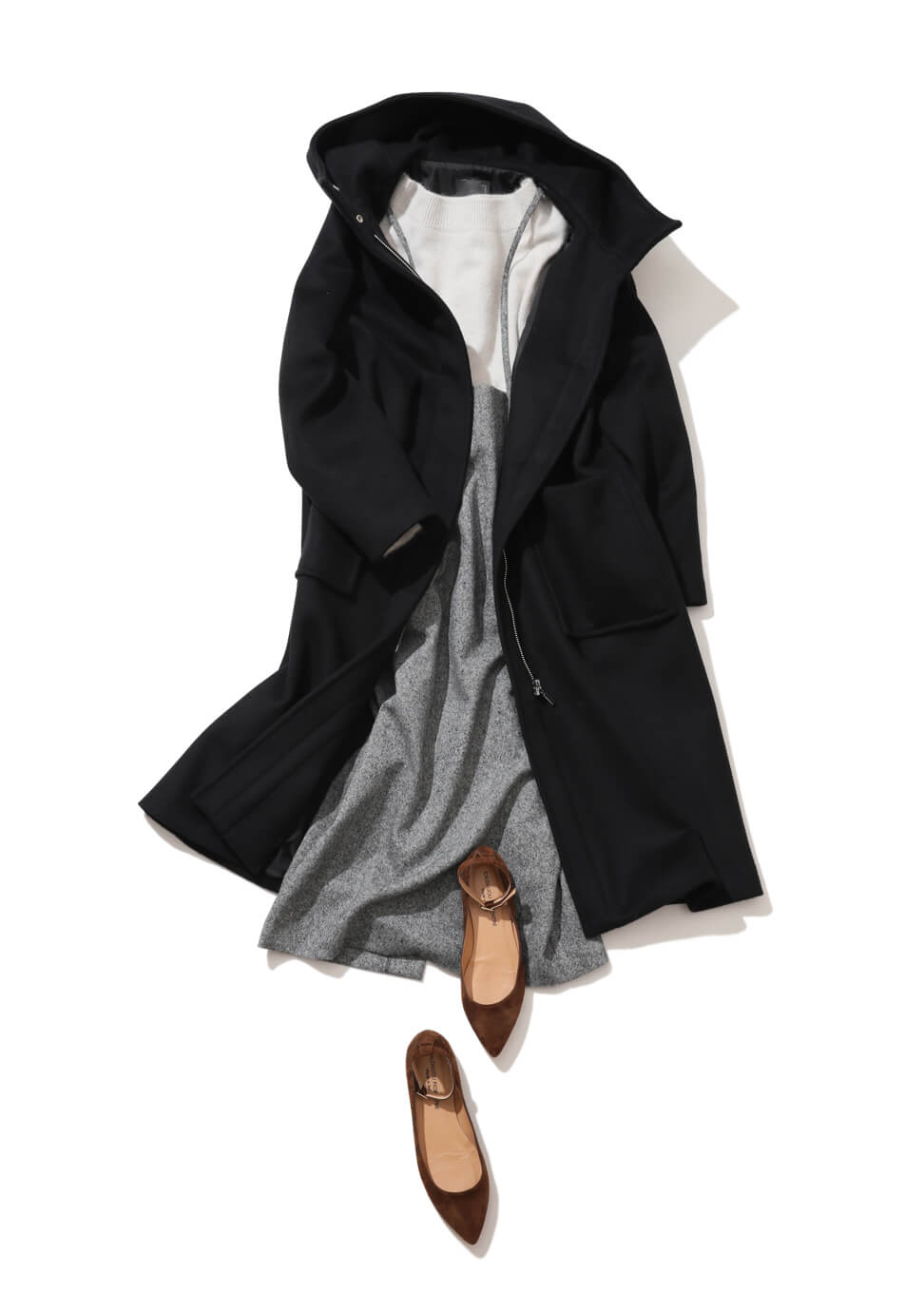 このシーズンに最適な、クラシックなツイード素材のサロペットスカートを主役に。カジュアルにならないよう、オンに着こなせるモノトーンコーデをメイク。相性の良いアウターのフーディはブラックをチョイスすれば、大人っぽくまとまります。インナーは、毛足の長いオフ白のアンゴラシャギーニットで優しげなニュアンスを漂わせて。