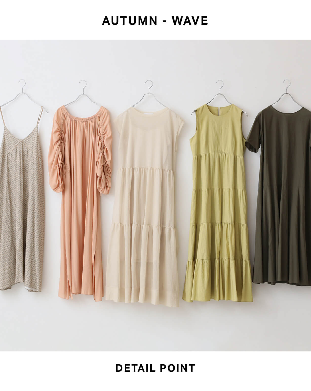 - こっくりしたカーキ&ブラウン、淡いベージュ&グリーンのラインナップ。淡い色ほど軽さが出て、こっくりした色ほどしっかりとモードな印象に。好きなムードで選んでみて。FRAMeWORKカーキワンピは濃色ながら、さらりと軽いラミー素材なので快適。トレンドのティアードワンピは涼しげなグリーンなら甘すぎず大人な着こなしに。