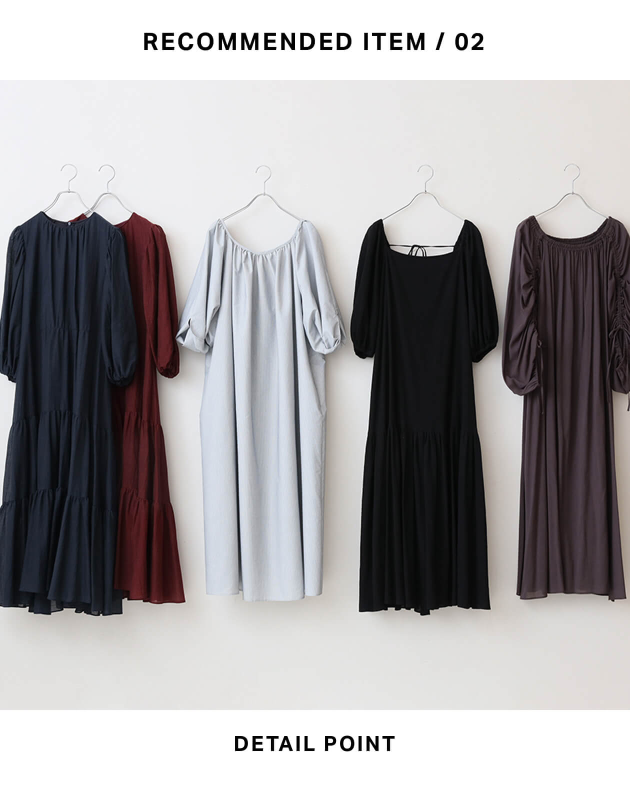 - フェミニンなボリュームスリーブのワンピースは落ち着いた色味で甘さを抑えて。ホワイトやブラック、ブラウンなどのベーシックカラーなら難なく着こなせます。おすすめはギャザー使いがアクセントに効いたデザインワンピース。リボンやドロストでシルエットを自在に調整できるタイプなら、体型に合わせた着こなしも叶って◎