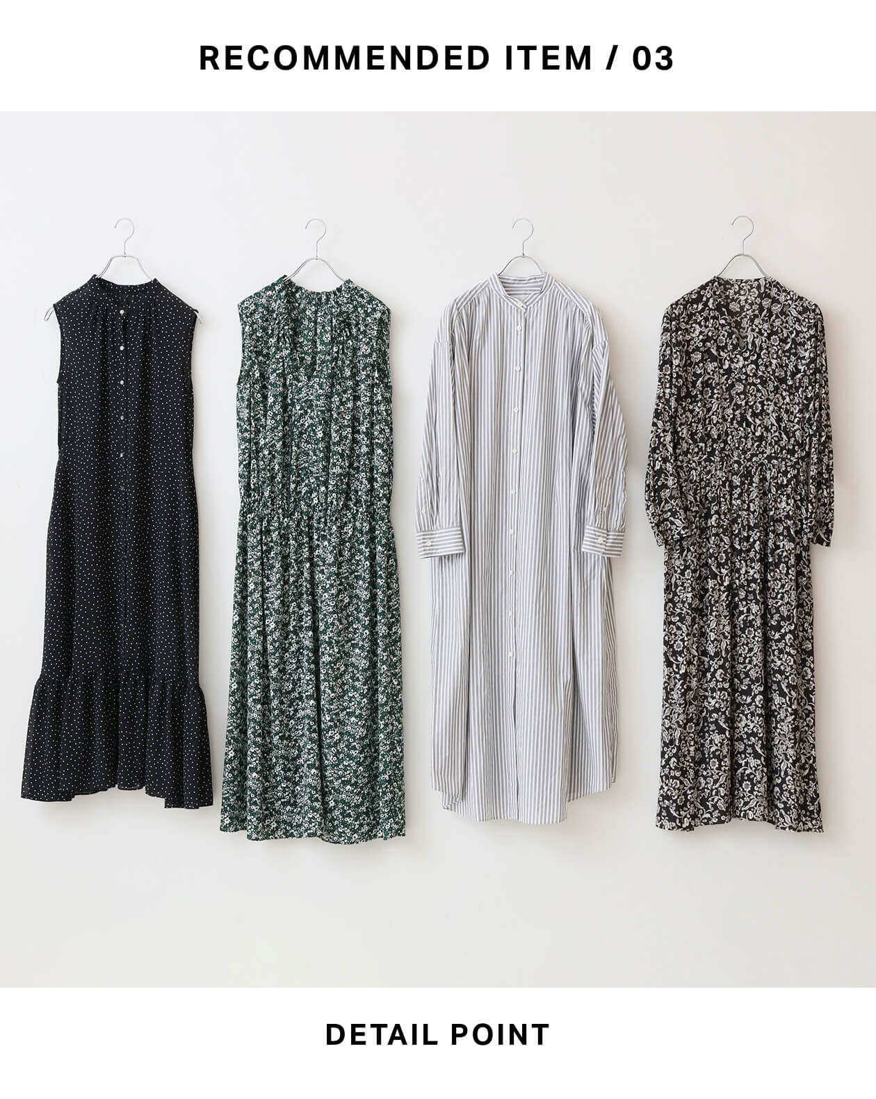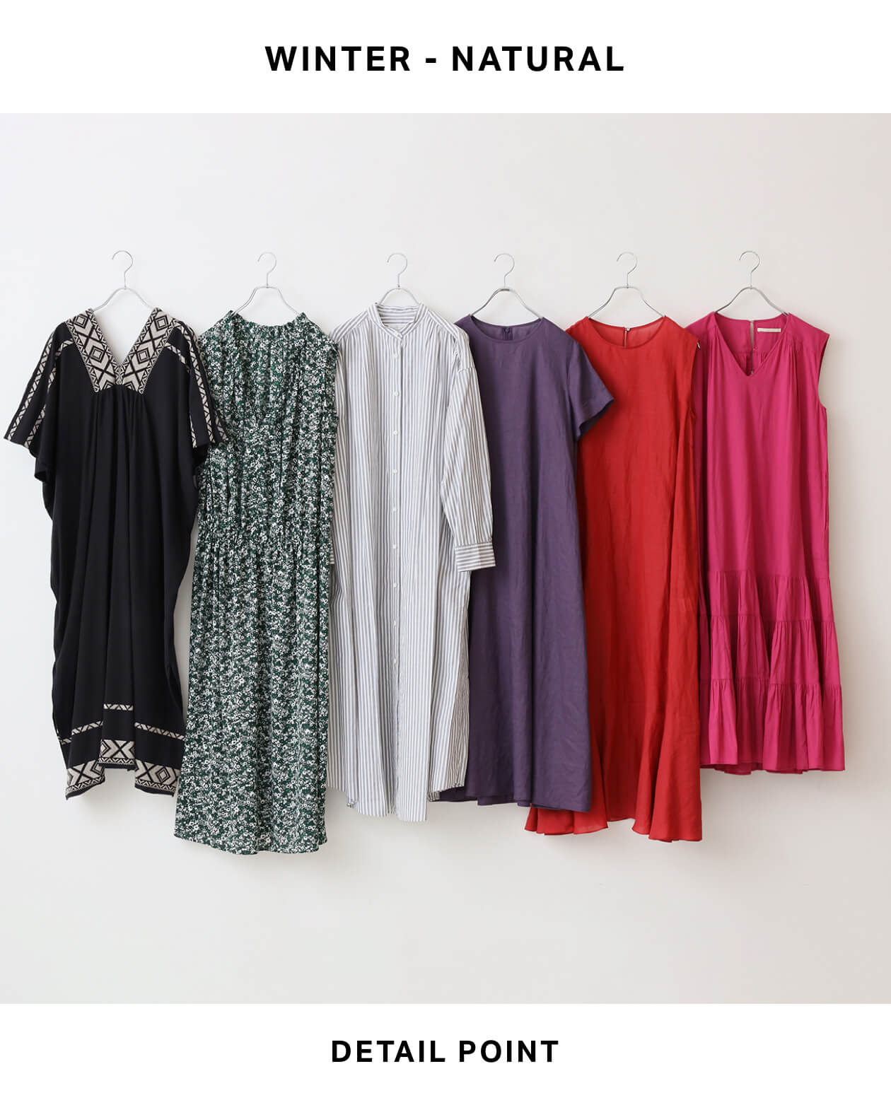 - モノトーンベースになってしまいがちなウィンターさんにこそトライして欲しいのが柄ワンピース。甘すぎず、大人でも気負わずトライできるストライプやドット、小花柄をセレクト。モノトーン同士でもぐっと華やかな印象になります。深みのあるグリーンならモダンな雰囲気にシフト。