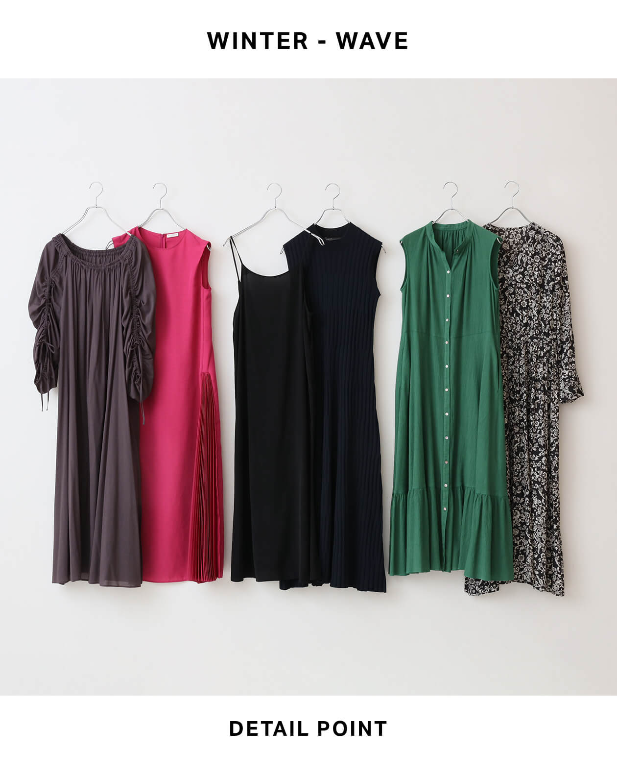 軽めのバランス感が似合うウェーブタイプは、ウエストに沿い裾にかけて広がるフィット&フレアシルエットが好相性。着丈も長すぎないものがベスト。袖や裾にひとくせデザインを取り入れるのもおすすめ。ランダムリブのニットワンピースや、サイドの細かいプリーツが印象的に揺れるサマードレスなら、ワンランクアップした大人コーデが叶います。 - NOBLE2WAYスリーブドロストロングワンピース◆¥33,000(税込)
