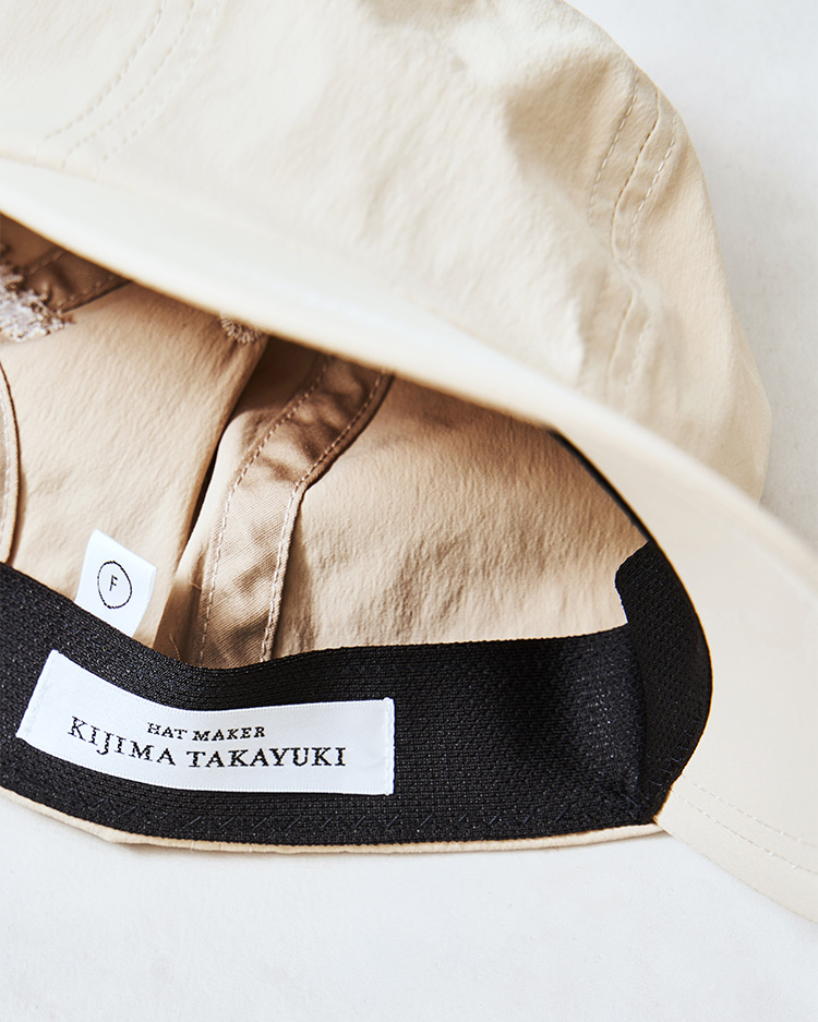 最適な万能キャップトータルコーディネイトで生きるデザインを作り出すKIJIMA TAKAYUKIとの別注キャップ。インラインのキャップをベースに本来使用されていない素材とディテールを組み合わせたハイブリッドなデザインに。ちょっとした雨にも負けない素材はシーンレスで被れます。バックの刺繍ロゴとベルクロの配色がワンポイント。