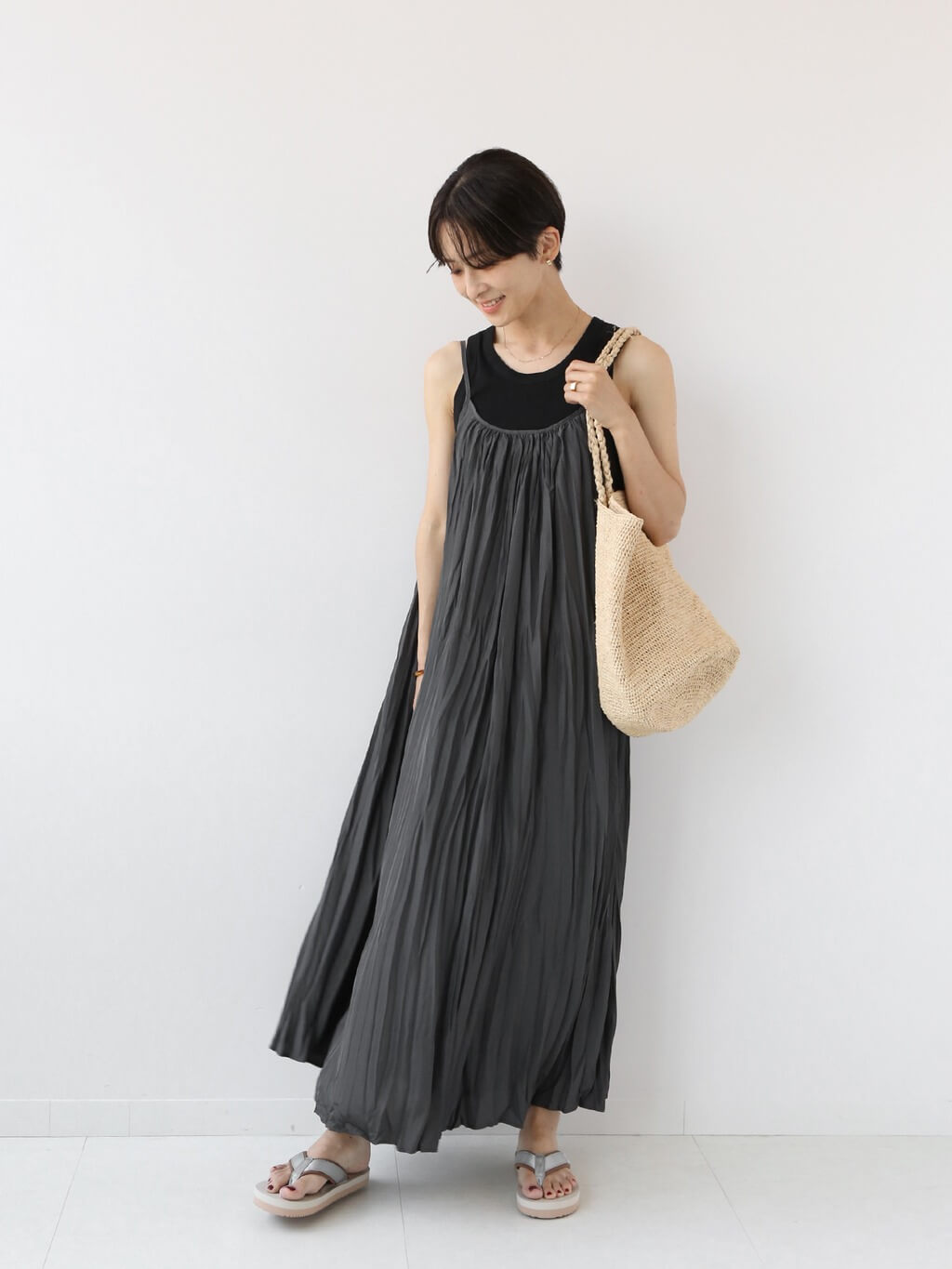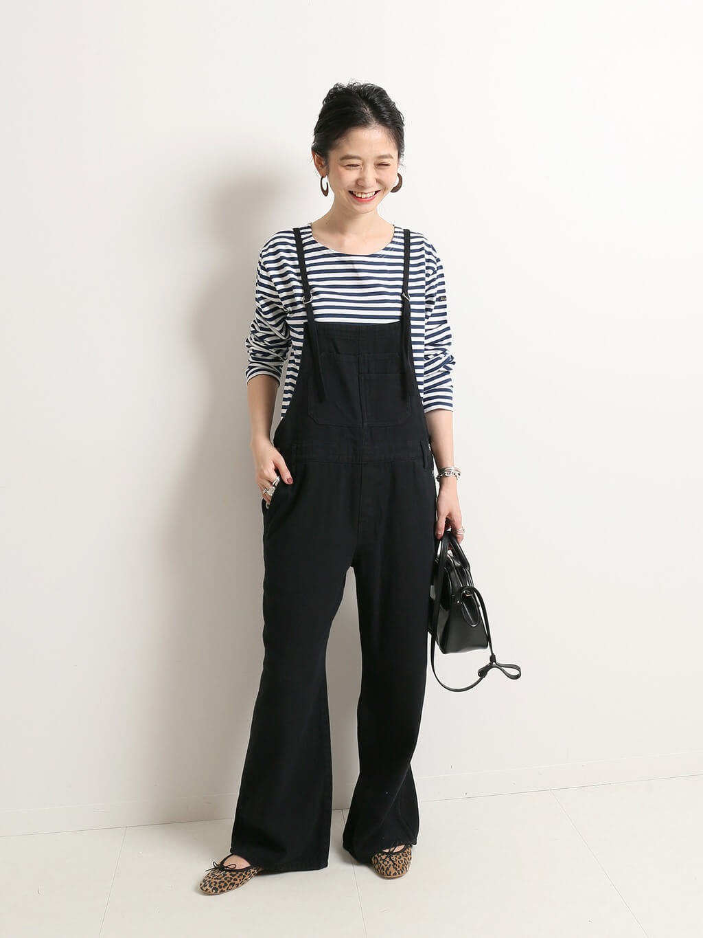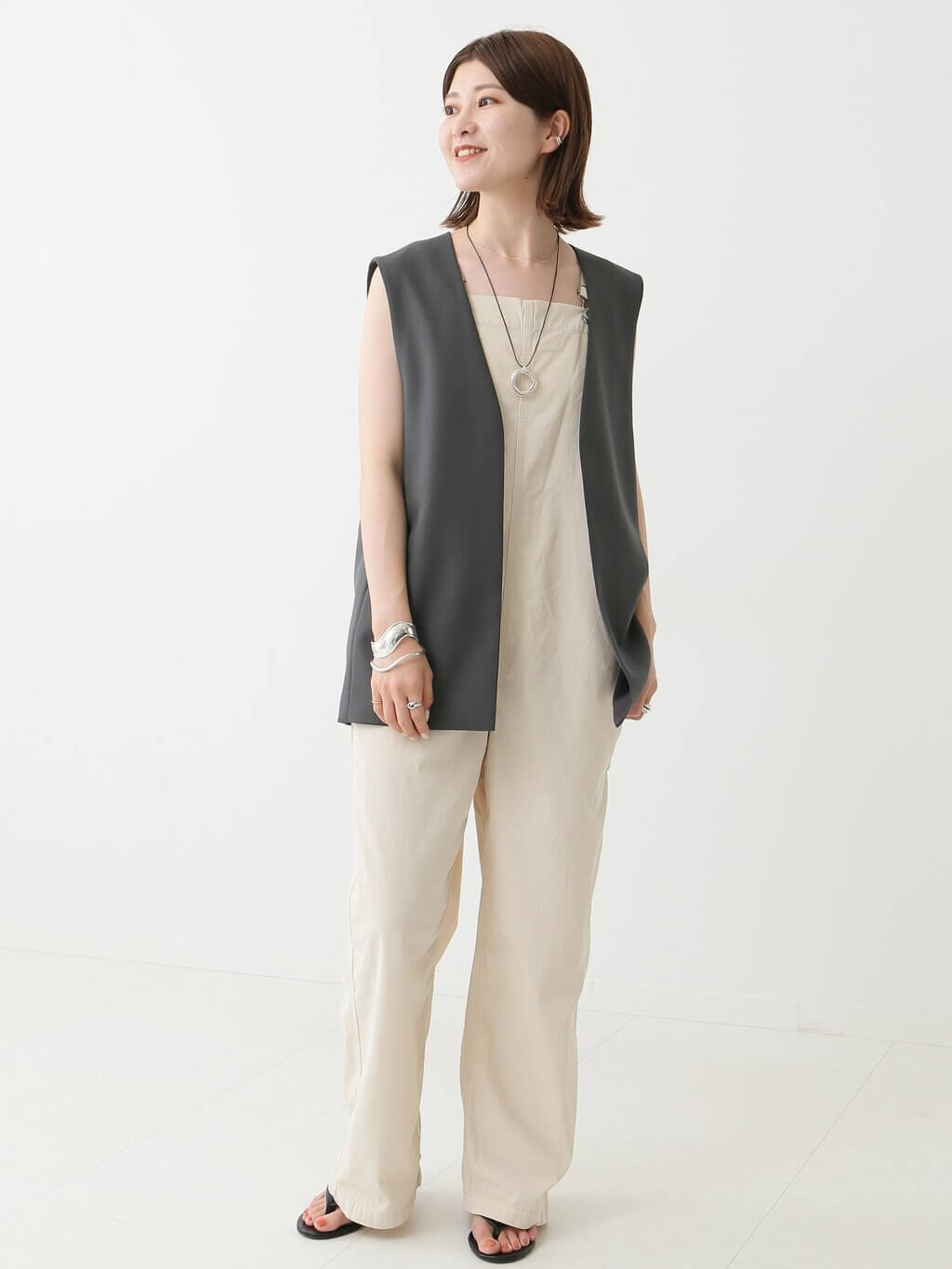 華やかなネックレスを重ねづけ。ルーズなサロペットも