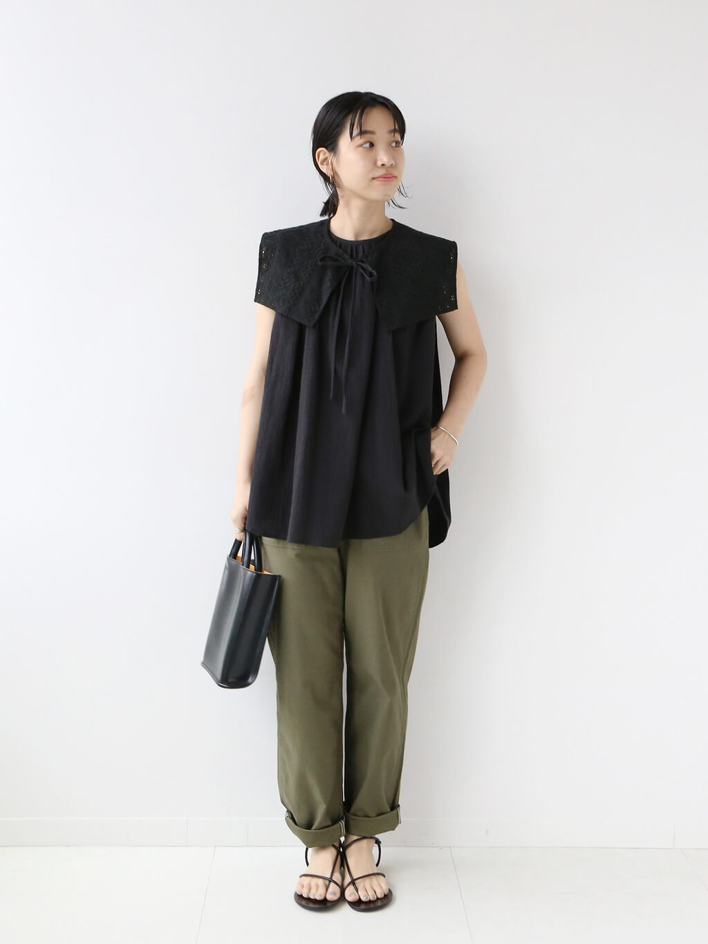 ワザありデイリー服でシンプルでも抜群に洒落る!大人可愛いレース襟付きブラウスが効いたパンツコーデや、