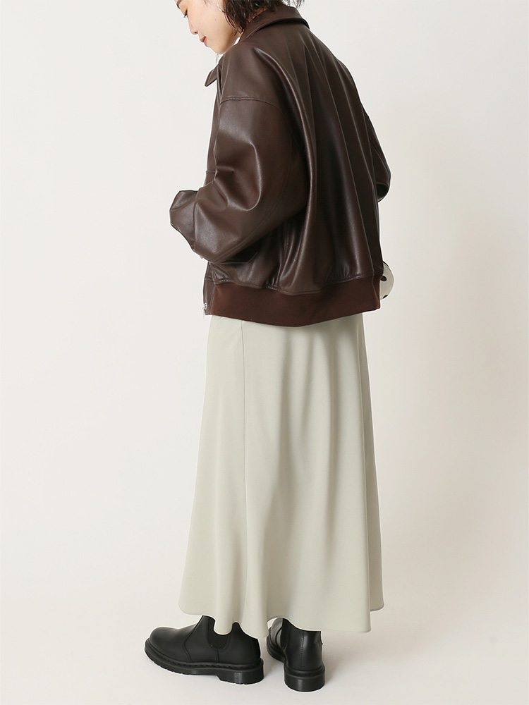 ヴィンテージブルゾンの型を羽織りやすいシルエットでブラッシュアップさせたフェイクレザーブルゾン。ワンピースと合わせて甘辛MIXに着こなすのがおすすめのスタイル。