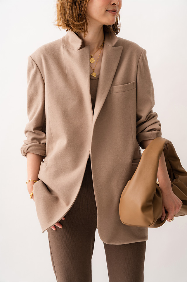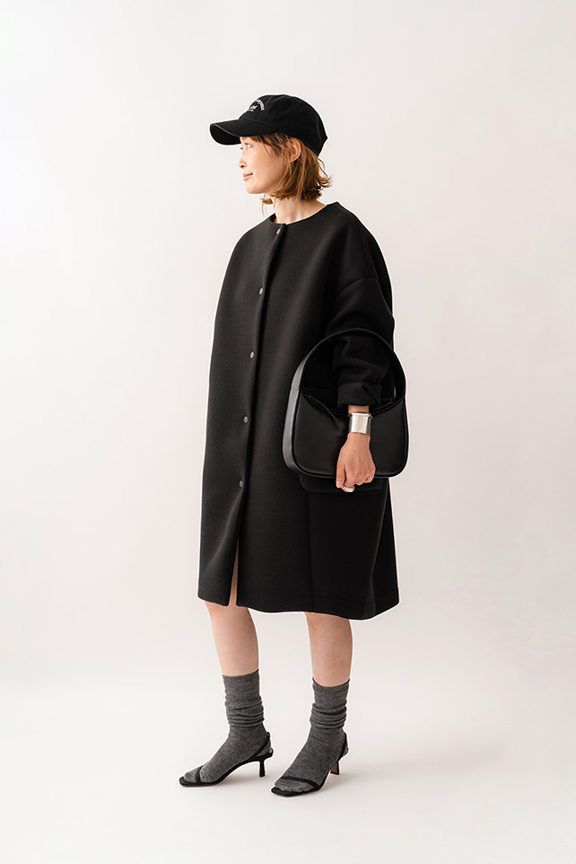 立体的なフォルムのコートは、着るだけでモダンな印象に。