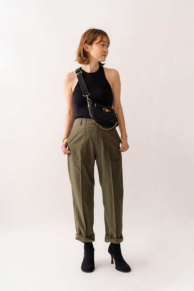 レイヤードしたのは、メンズデザイナーが作る“KURO”のカットソー。シンプルでどこか無骨に見えるデザインだが、計算されたサイズ感とロールアップした時の袖のボリュームが完璧。