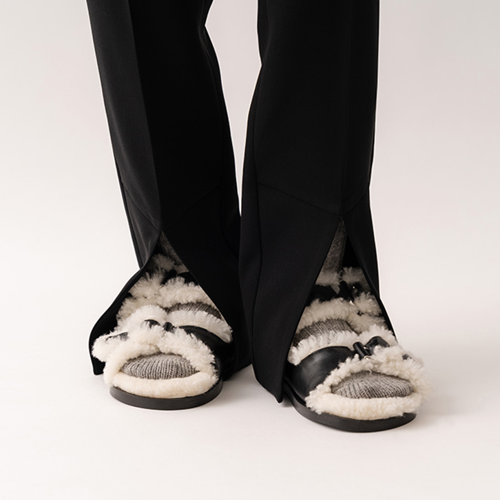環境に配慮しリサイクルムートンを使って作られたサンダルは、素足でもソックスレイヤードでも足元も楽しめる。- Deuxieme Classe【FUR DELUXE/ファーデラックス】ファーサンダル¥39,600(税込)