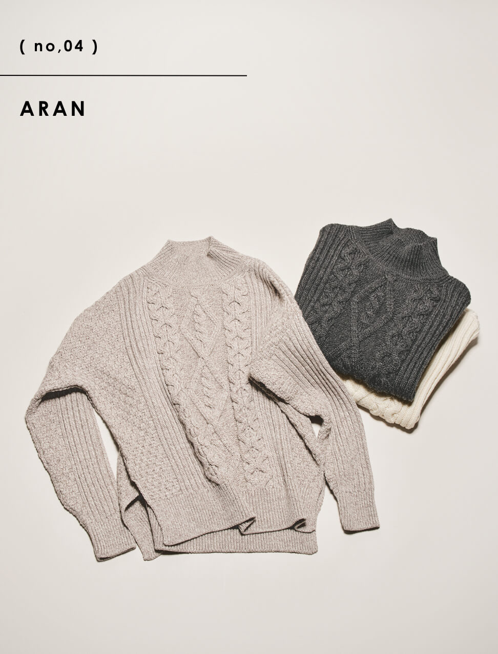 毎年人気のアイルランドのニットウェアブランドARANよりFRAMeWORK別注ニットが今年も登場。程よく首に沿うようなネックライン、着膨れしないスッキリとしたシルエット。こだわりぬいたデザインは、年齢を問わず幅広い方にオススメのアイテム。冬の定番ニットのワードロープの一着に。