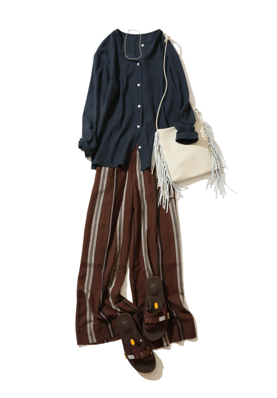 着心地抜群のシャツブラウスに体が泳ぐワイドシルエットのパンツを合わせた、暑さ和らぐリラックスコーデ。褪せたようなネイビーとブラウンのリゾートライクなランダムストライプのカラーリングは、シックでこなれ感たっぷり。ネックレスとフリンジバッグをトッピングして、さらにスタイリッシュな印象を引き寄せて。
