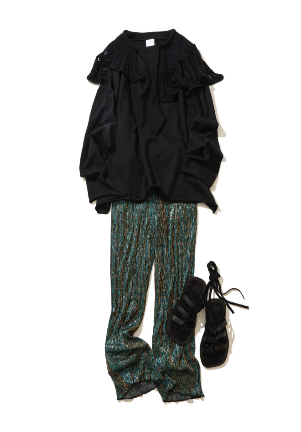 肩周りの大きなフリルがキャッチーでモードな黒トップスなら、甘デザインでも大人っぽく着こなせておすすめ。合わせたのは、異なる2色のラメ糸で織り込むことで、光の当たり方次第でニュアンスが変わる表情豊かなパンツ。足元はスエード×レザーのモードな抜け感のあるサンダルでエッジをプラス。
