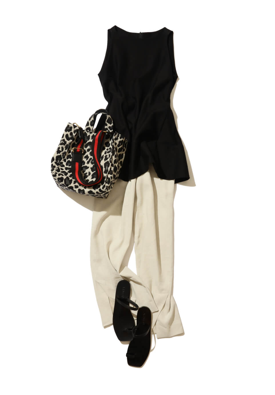 オフィスに出社する日のコーデは、キレイめに仕上がるホワイトパンツのモノトーンコーデで凛とした雰囲気に。麻素材のパンツだから猛暑の出勤でも涼しげで大人っぽい。足元はフラットトングサンダルで抜け感を加えつつ、ちょっぴり秋を意識したレオパード柄トートバッグでリズムをプラス。