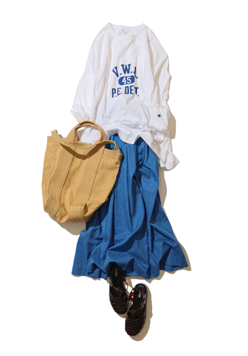 おうち時間がメインの木曜日は、ストレスフリーに過ごせるゆるトップス×ウエストゴムスカートのコンビネーション。トップスのロゴカラーとスカートのカラーを合わせることで、こなれた雰囲気に仕上げて。大人可愛いフレアスカートは、爽やかでシーンレスに着回せるブルーで決まり!