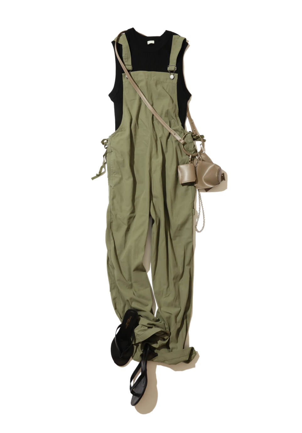 オフの日曜日は、一点投入でサマになって着こなしに一手間感が加わるサロペットを頼って。一見するとカジュアルだけど、背中のVシルエットやしなやかな素材、こなれた色落ち具合などこだわりが詰まったデザイン。お洒落感度を高めるポーチバッグを肩掛けして、メリハリをつけるのがポイント。