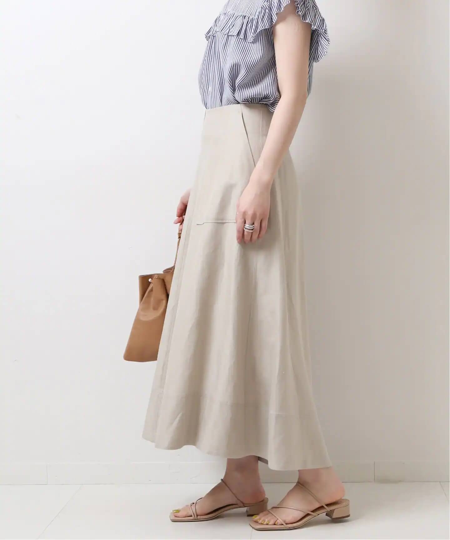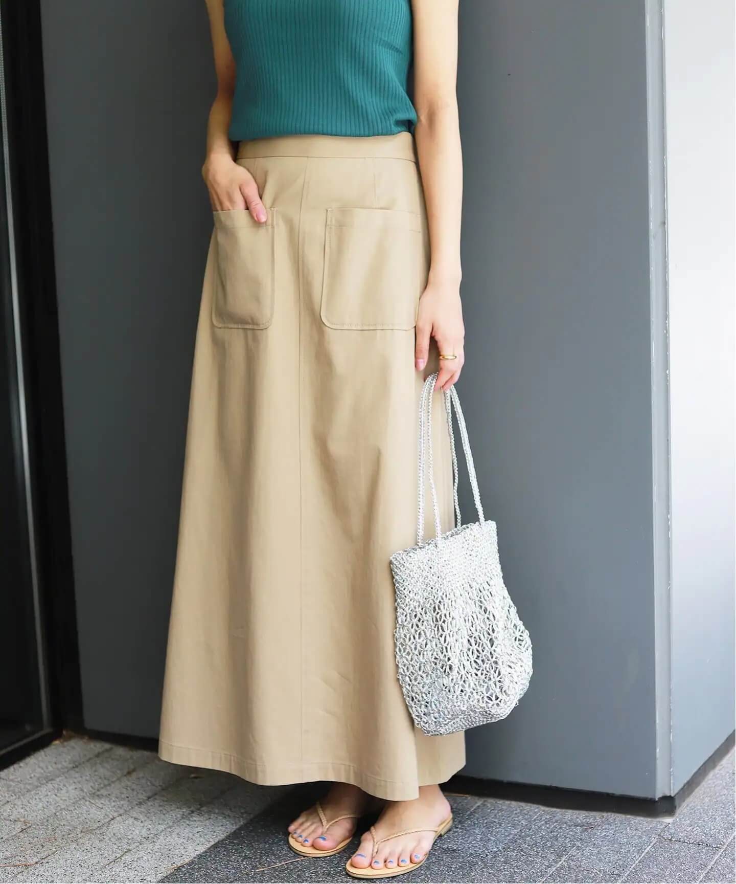 ベージュの控えめフレアカジュアルなビッグポケット付きのデザインや