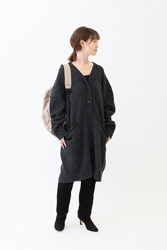 ありそうでなかったワンピースのようなオーバーサイズのカーディガン。そのままのディティールを生かしてロングブーツとの着こなしも新鮮。着るだけでオシャレ度がぐっとあがるブルーはあえてメンズライクなサロペットに合わせて、カジュアルダウンした着こなしもおすすめ。