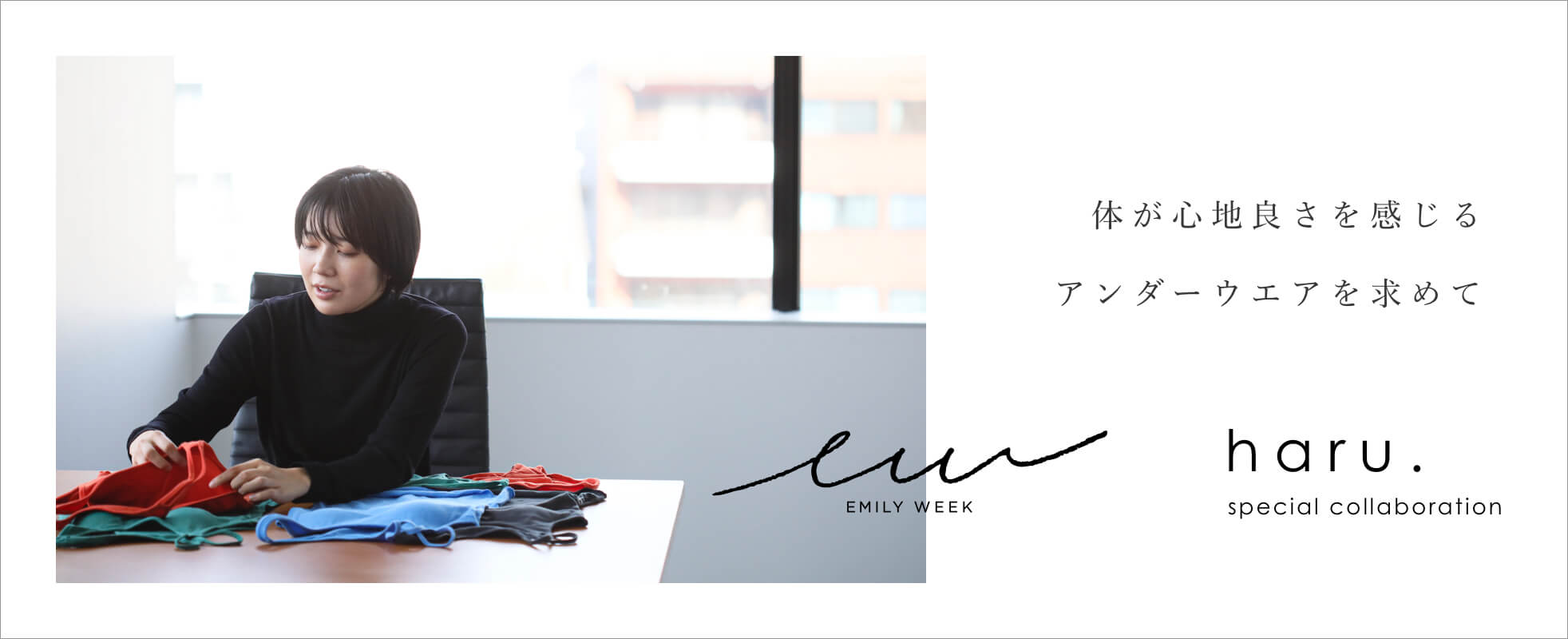 HIGH(er) magazine編集長で株式会社HUG取締役のharu.さんとEMILY WEEKがコラボレーション。オーガニックコットンのタンクトップとサニタリーショーツを発売しました。下着好きのharu.さんのこだわりがつまったカラフルなアイテムは、落ち込みがちな日こそまといたい、気分を高めてくれるお守りみたいな存在。今回のモノづくりについて掘り下げて聞いてみたら、飾らない姿の奥にしなやかな強さを秘めた彼女自身の魅力も浮かび上がってきました。