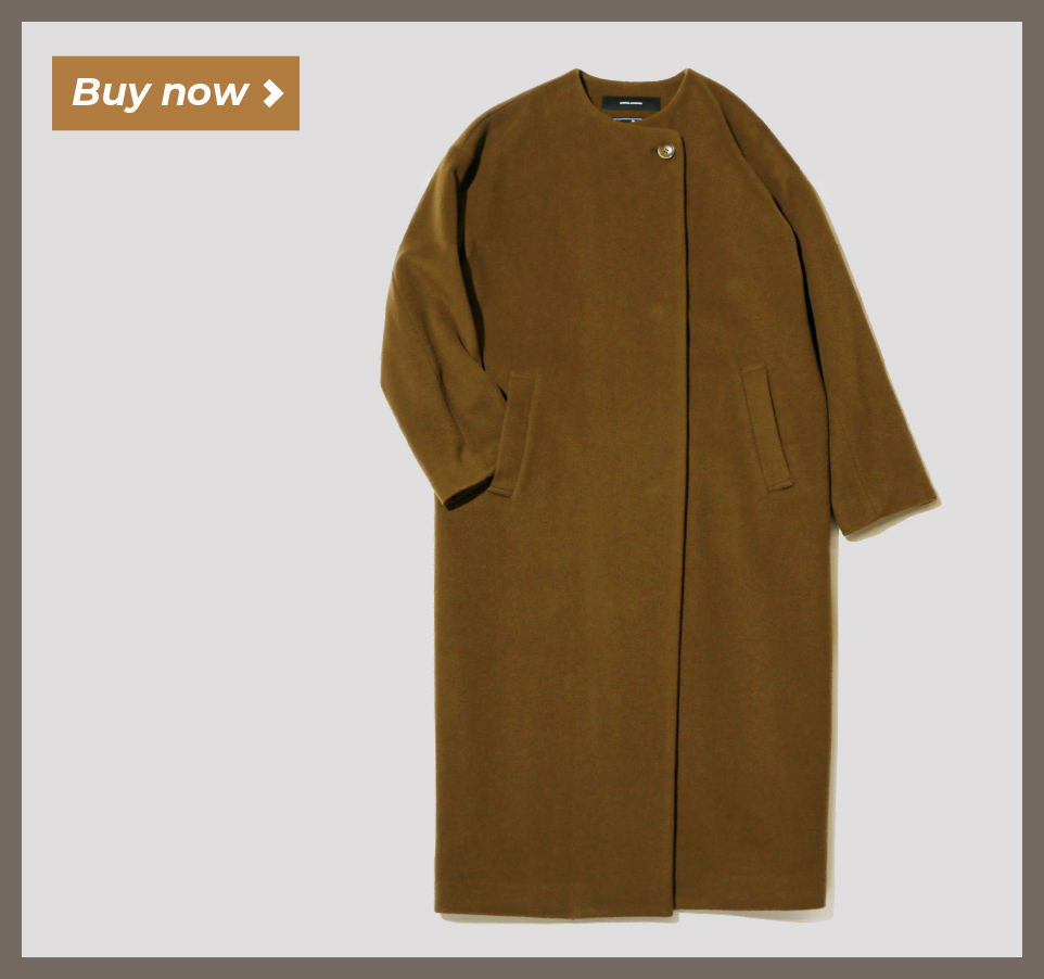 今年のアウターはノーカラーのデザインを多く見かけます。ノーカラーって一見、コンサバに見えてしまいがちですが、カーキでミリタリー要素が入っているところが気に入りました。なめらかなメルトン素材とミリタリーというMIX感が新しいなと思い、冬コートとして要チェックです。