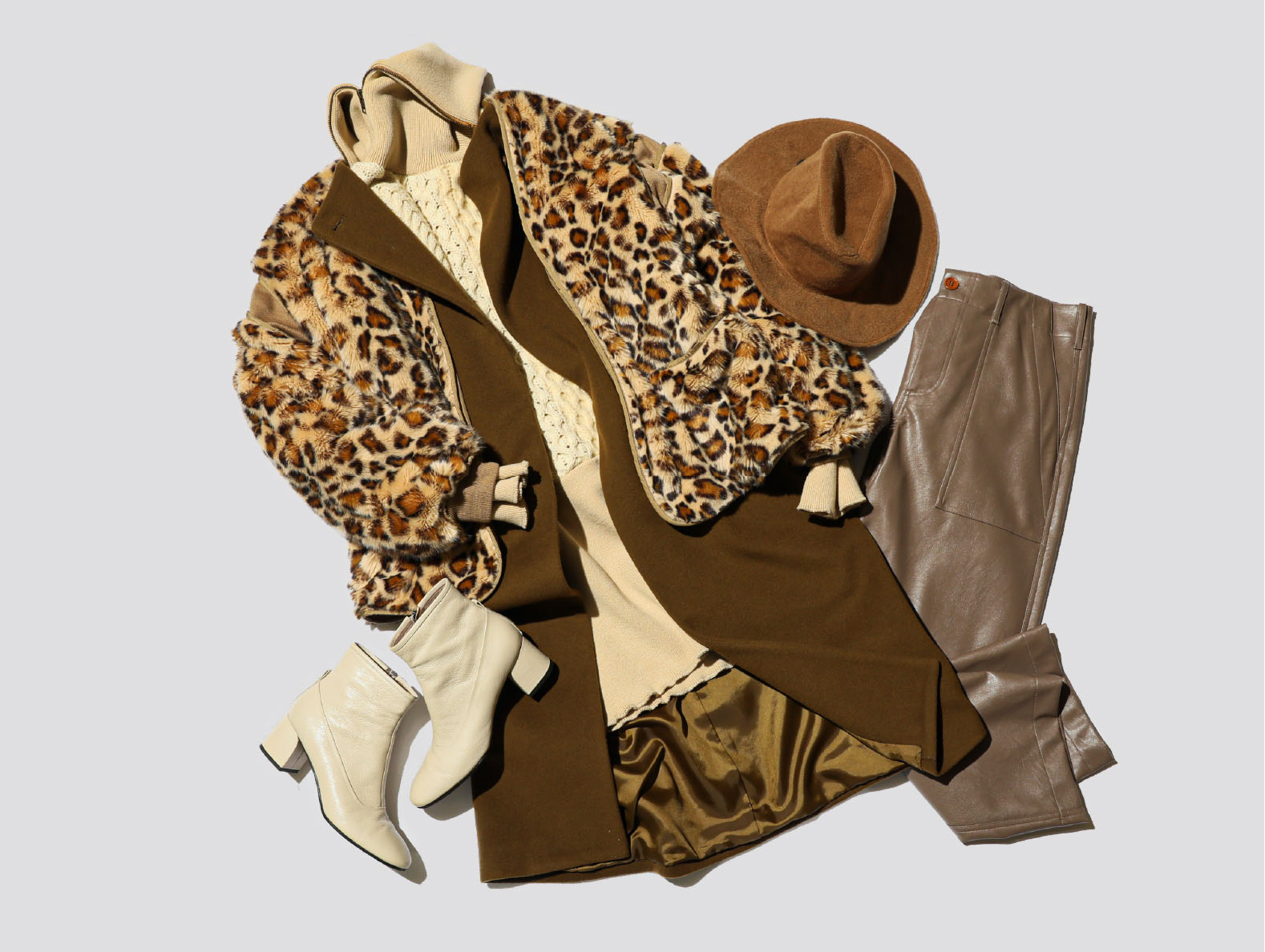 首もとざっくりのタートルネックニットを合わせただけでなく、レオパード柄のアウターを羽織って大人っぽいけど遊びのあるコーディネートに仕上げました。ボトムにはレザーパンツ+ブーツを選んだのですが、優しい色味なのでハードさより上品さが際立つので、この冬らしい着こなしとしておすすめです