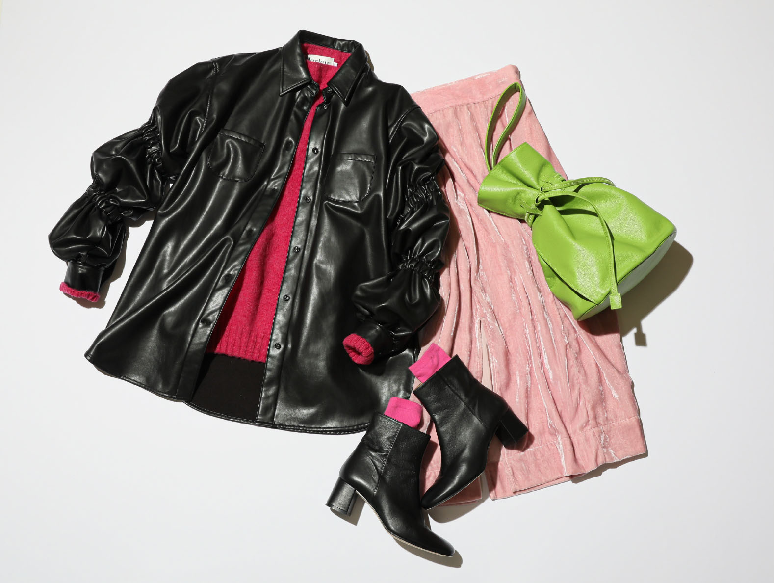 ニット、レザー、ベロアといった素材違いで遊びつつ、ハッピーな色合いでテンション上げめなガーリースタイルに仕上げました。同じ色合いでも素材が変わると着こなしに変化もでて、おもしろくなると思います。幼くなりすぎないために、黒のレザーシャツジャケットやブーツで締めてあげるのがポイントです。