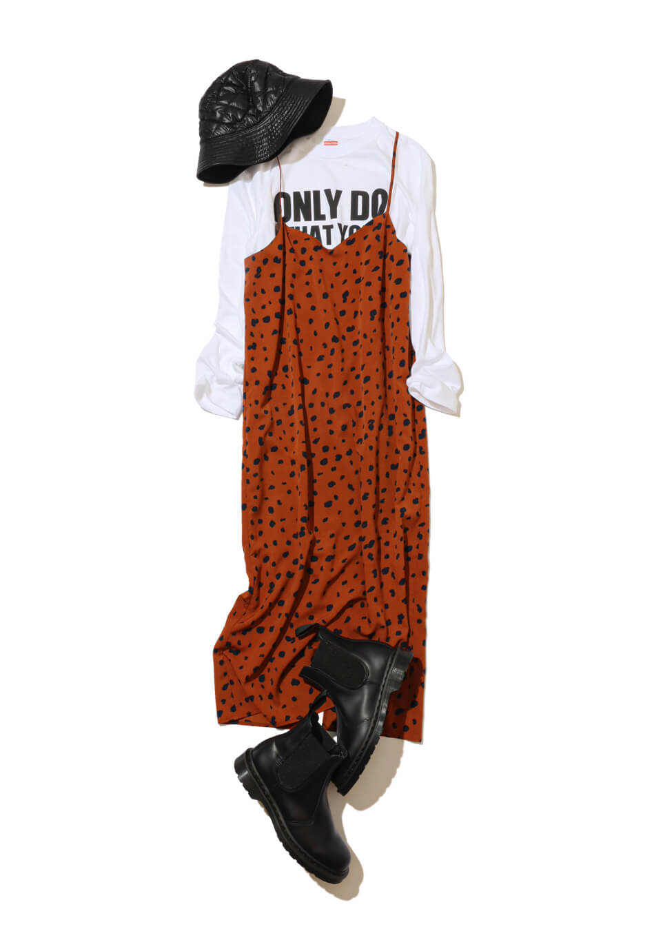 トレンドのこっくりカラーワンピースは、マットな色合いのレオパード柄が都会的なムード。キャミワンピにインしたロゴTとの相性も◎さらにトレンドムードが高まる厚底のチェルシーブーツ、ハードな素材のバケットハットとサンドイッチして、今年らしくブラッシュアップ。