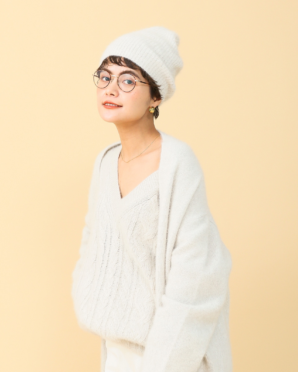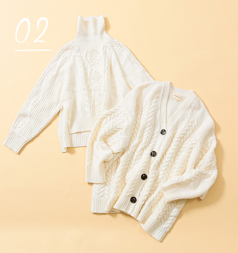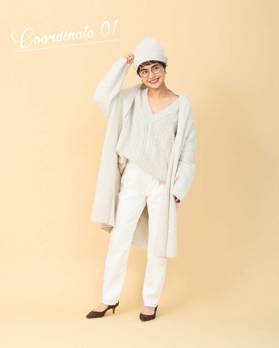 - パンツコーデも一気に華やぐから、白はオンもオフも心強い味方。ゆるケーブルニット×ふわふわカーディガンのニットレイヤードも、同色でまとめれば野暮ったくならず、オフのリラクシングなムードを演出。とはいえ足元は辛口ヒールでピリっとスパイスを。