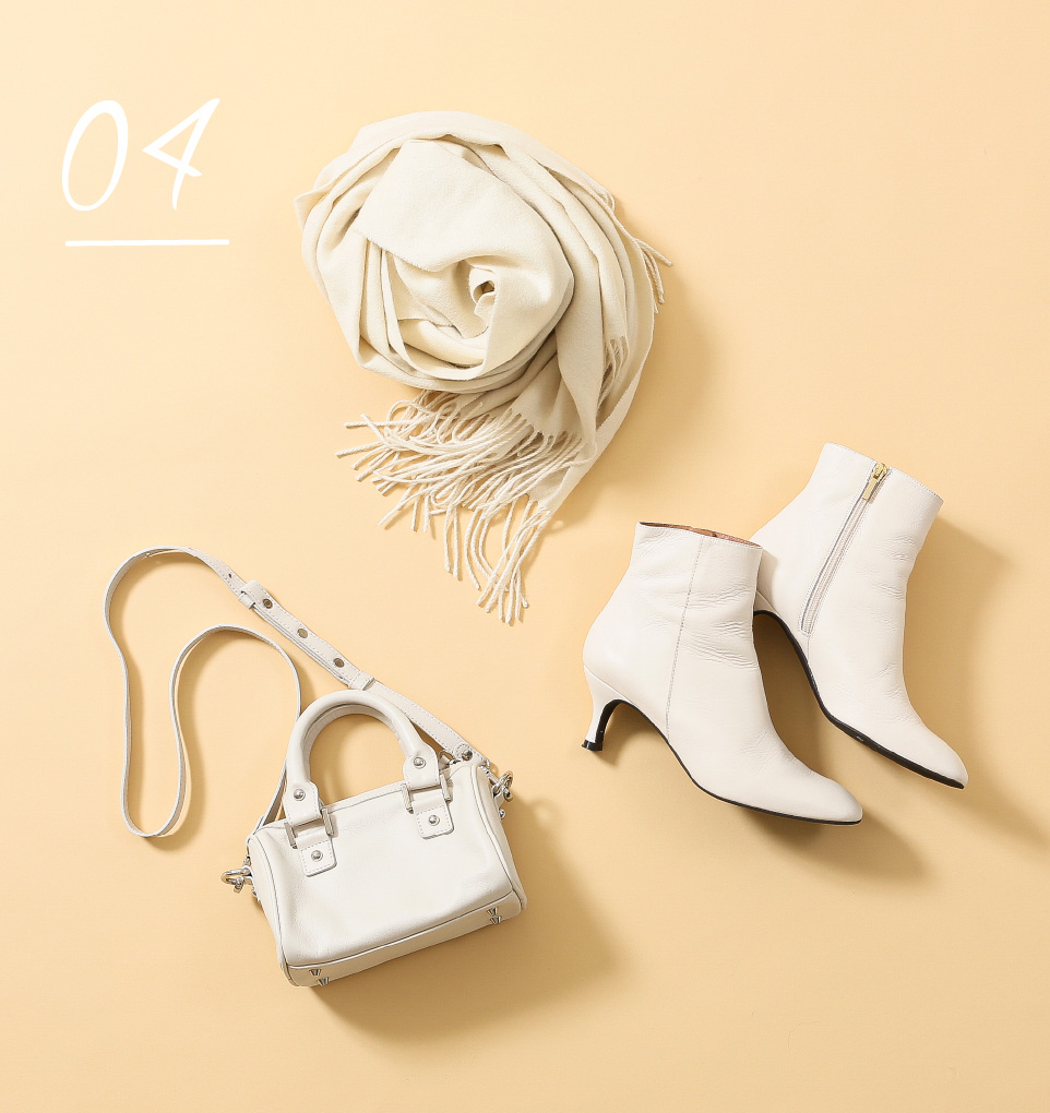 - 温かみのある色味だからこそ、小物は切れ味の良いモードなデザインを選んでほっこりさせない工夫を。この秋冬トレンドのホワイトブーツは、モードな雰囲気を簡単に足せて高感度なスタイルに格上げ。
