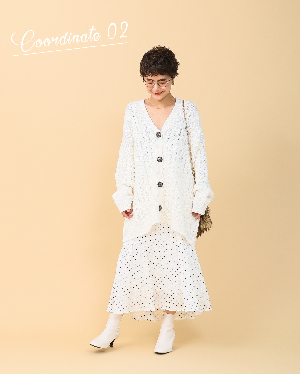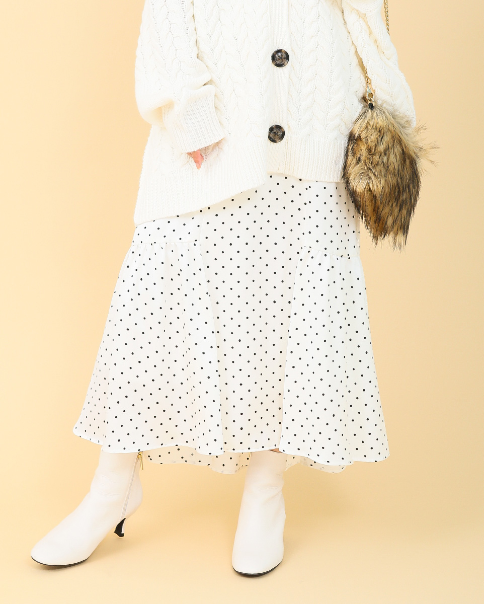 - デートに最適なドットスカートコーデは、白にまとめると可愛げがアップ。トレンドの白ブーツがモードな雰囲気に。肩の力の抜けたオーバーサイズのカーデを合わせて、頑張りすぎないフェミニンコーデをメイク。華奢見え効果も期待できそう。