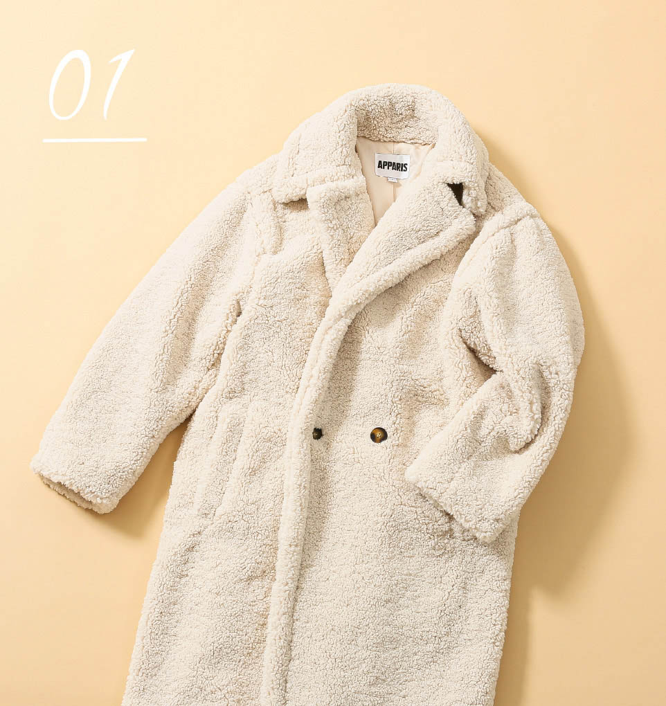 - エコファーコートを手がける「APPARIS」のボアロングコートは、今年本命の着映えアウター。もこもこで見た目にも温かなボリューム感がありながら、袖を通すと驚くほど軽い着心地なのも嬉しい。