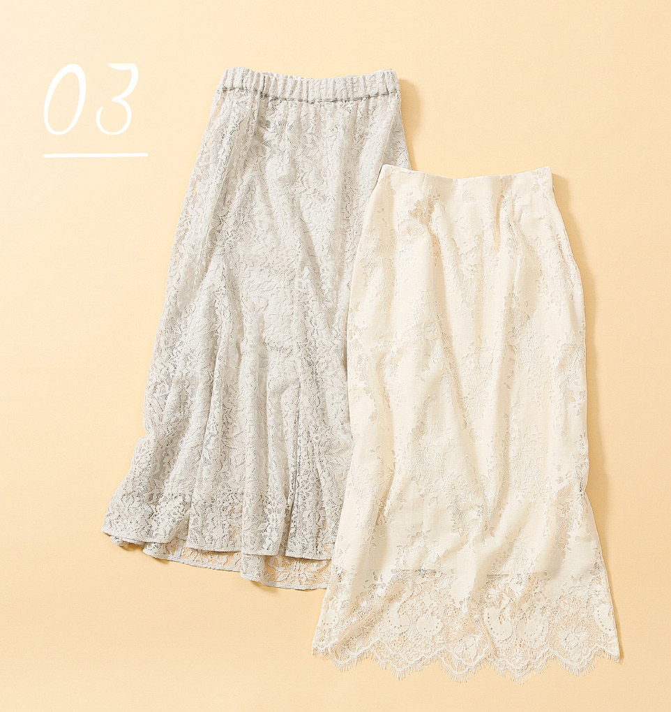 - 重めのカラーや素材でまとまりがちなシーズンこそ重宝する、レースのスカートは冬ワードローブにマスト。コーデにとけこみやすくて洒落感を高めるオフホワイトなら、甘くなりすぎず◎。