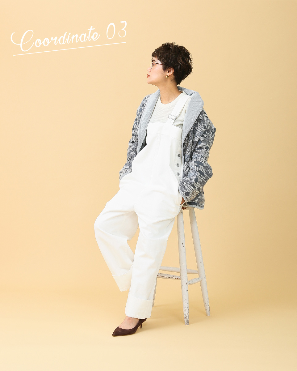 - カジュアルなオーバーオールも、白のワンショルダーなら大人っぽく洗練された印象に。さらにメンズライクなナバホカーディガンをラフに羽織って、こなれたムードを高めて。足元はポインテッドトゥのヒールが鉄則。