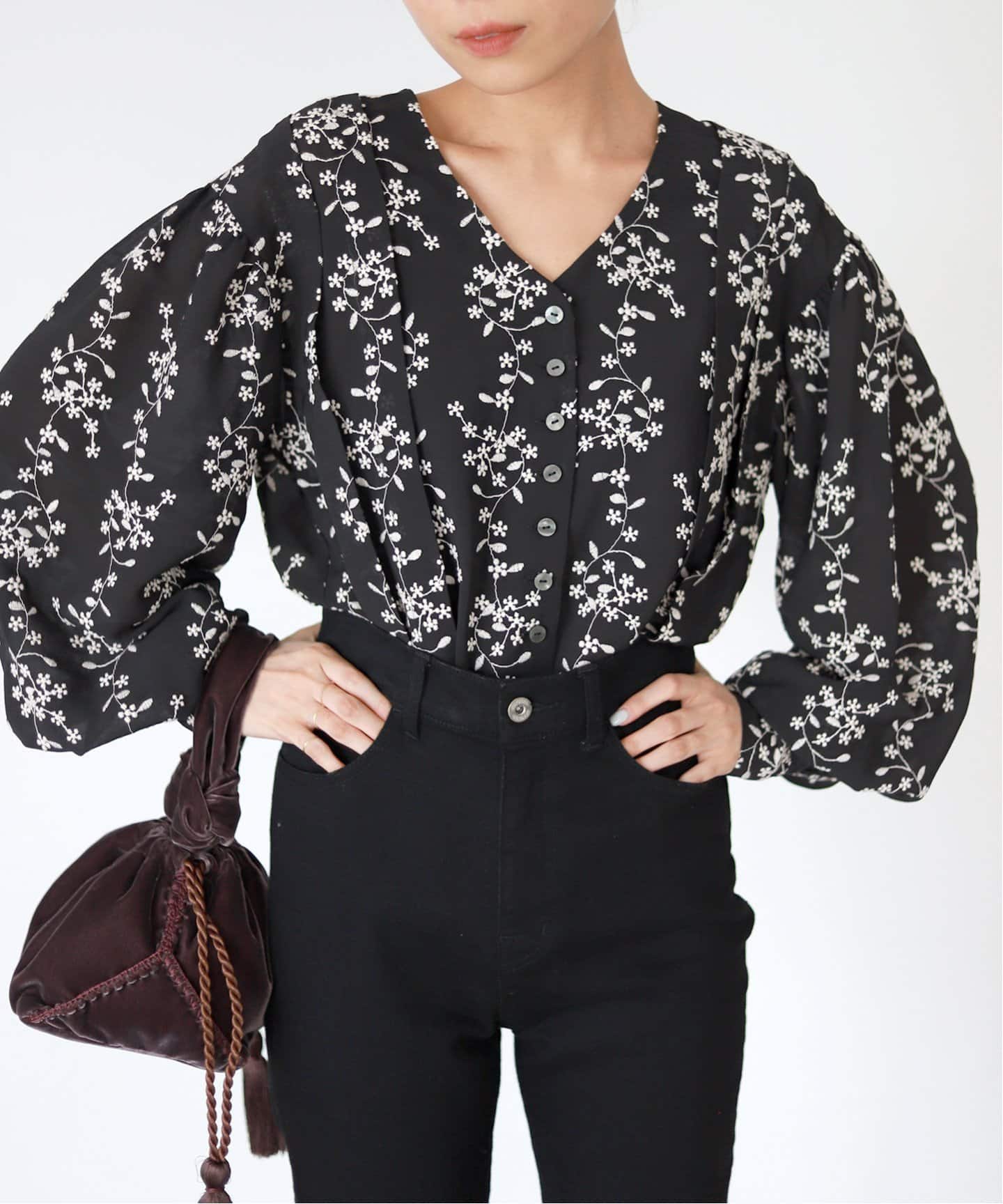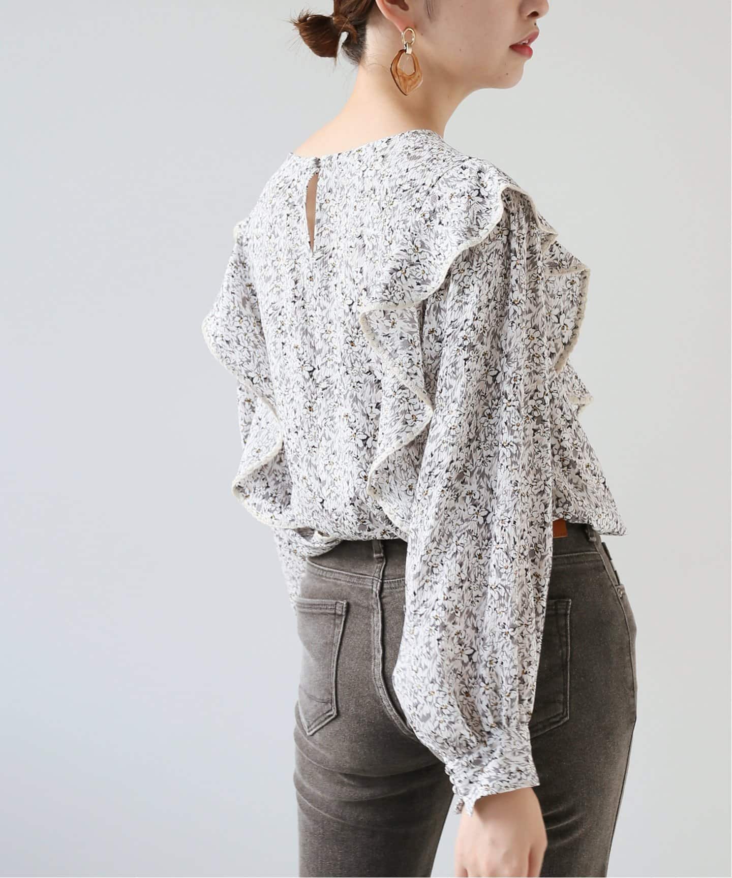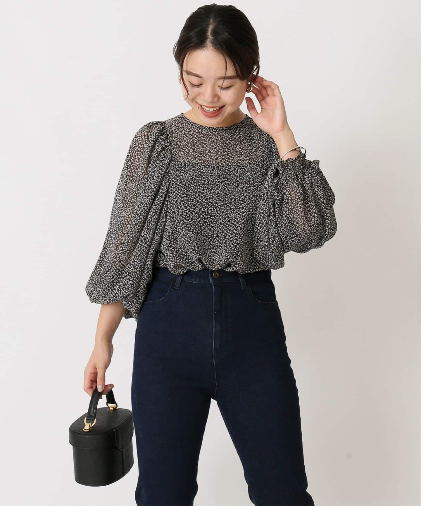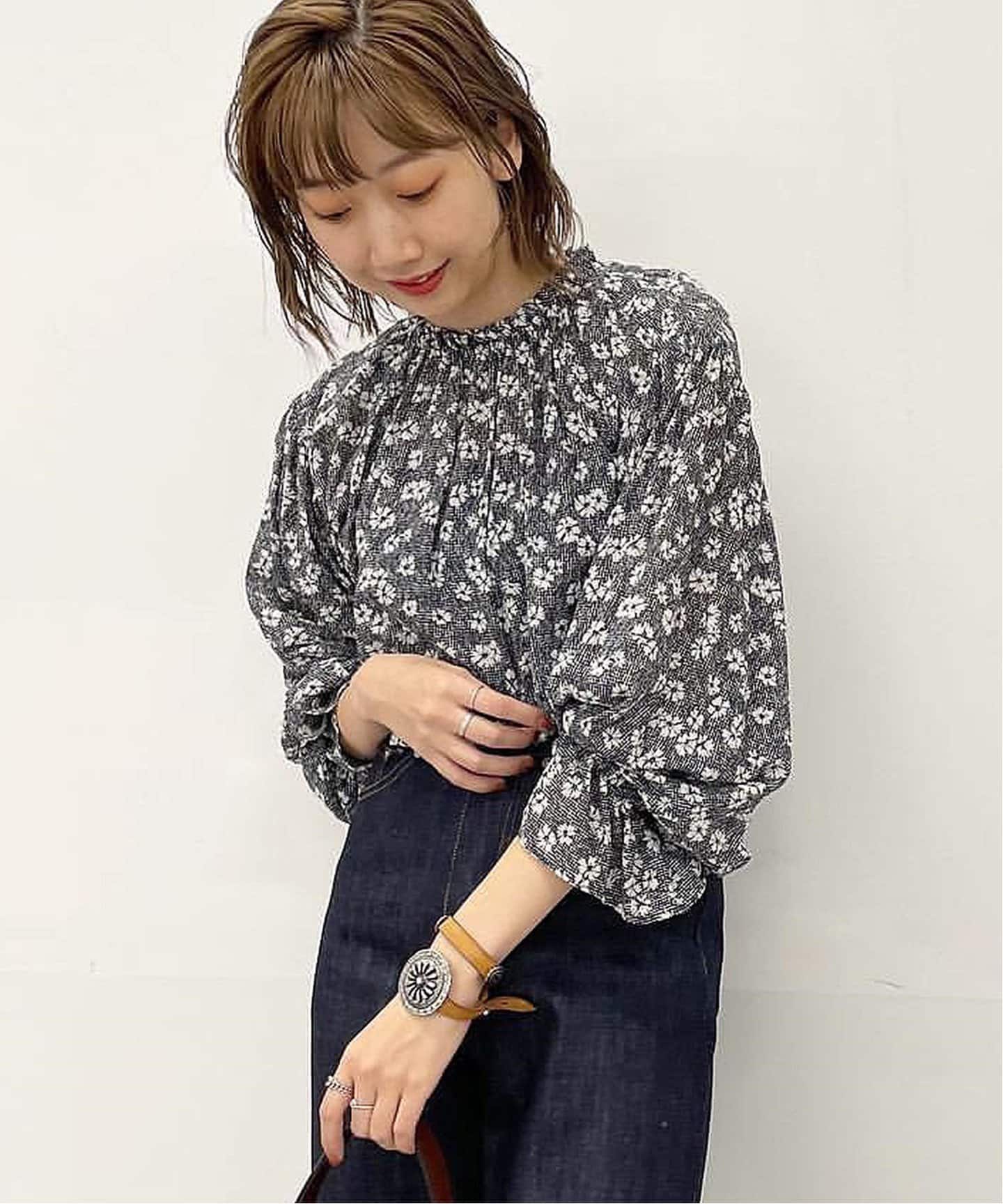 モノトーンの小花柄ブラウスで