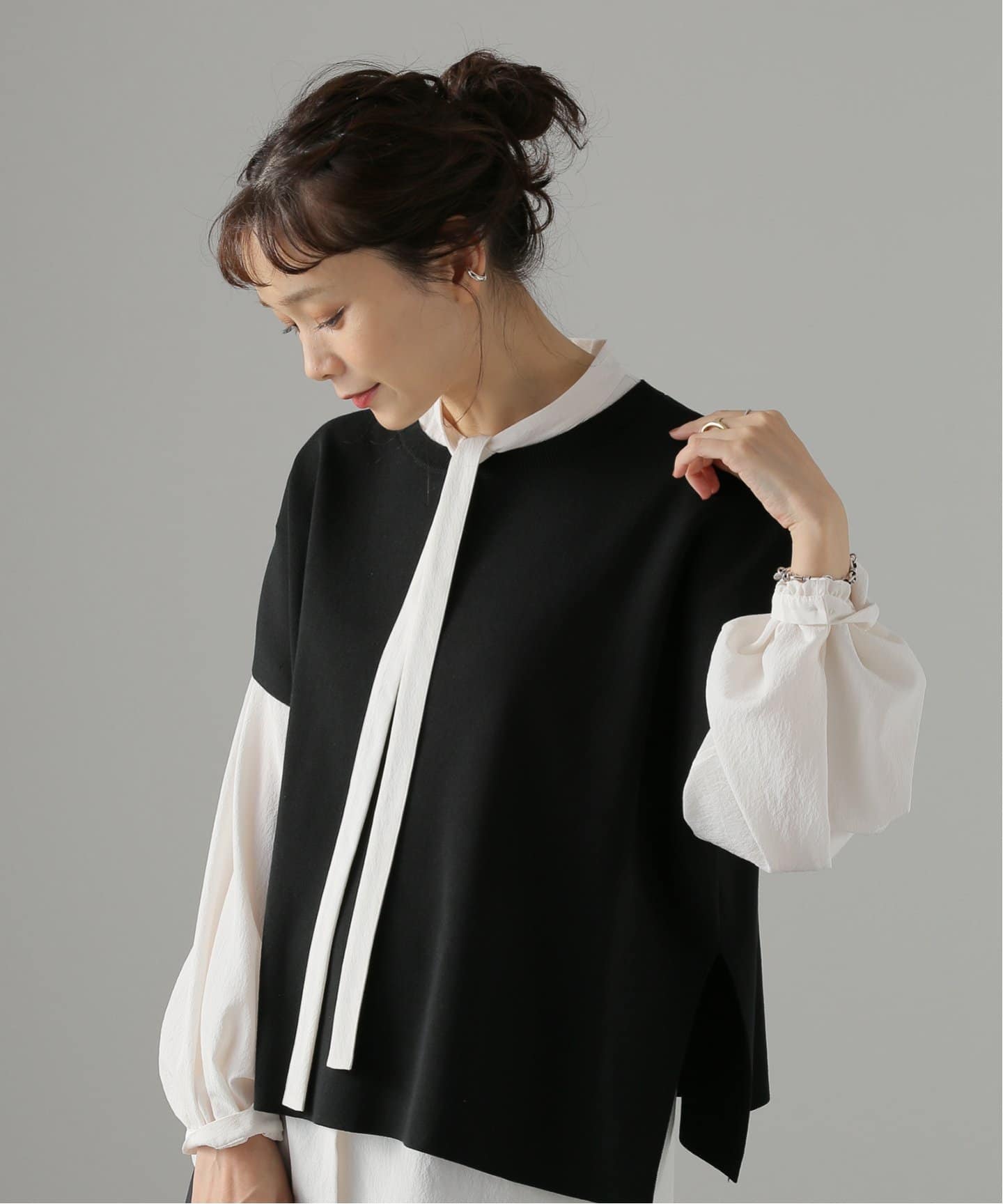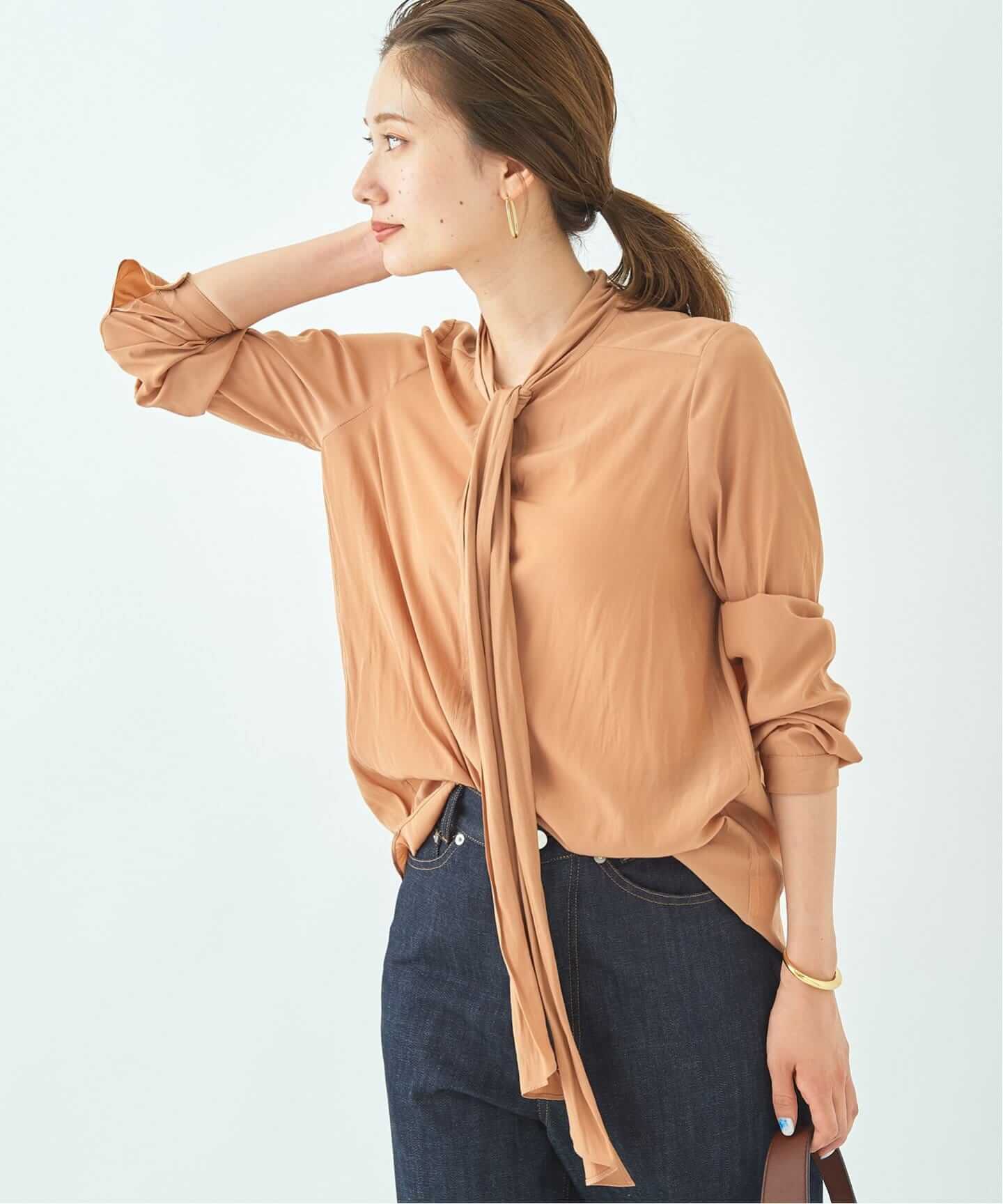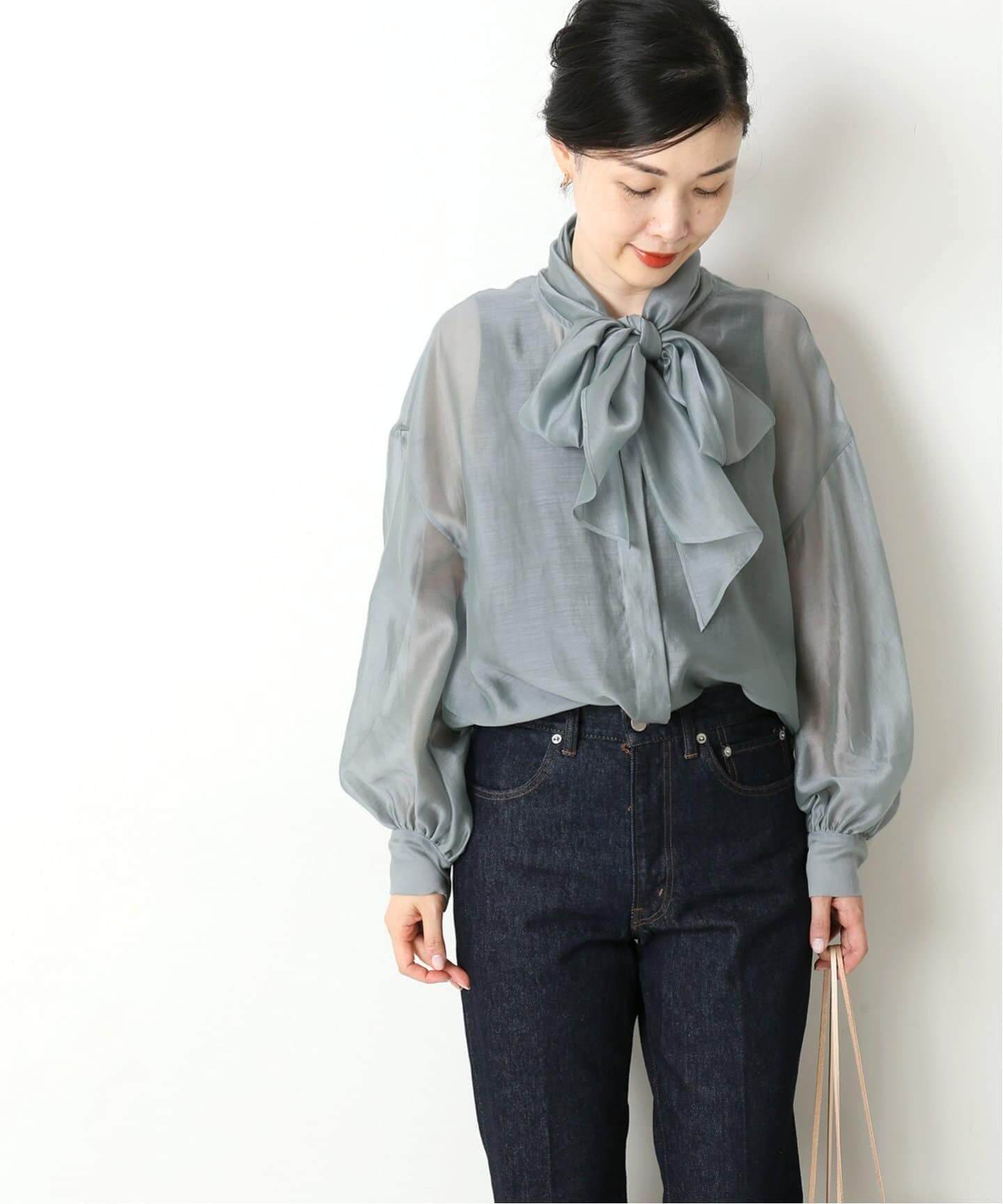 上品で大人っぽいボウタイブラウスは、