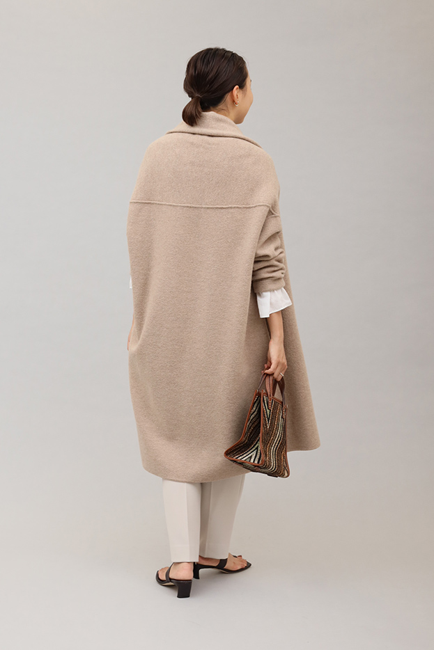 カットソーにリラックスパンツのカジュアルコーデに、すっきりきれい見えするガウンコートを羽織って大人っぽく。今年らしいミニショルダーバッグは、アクセサリー感覚でコートの中に忍ばせて。