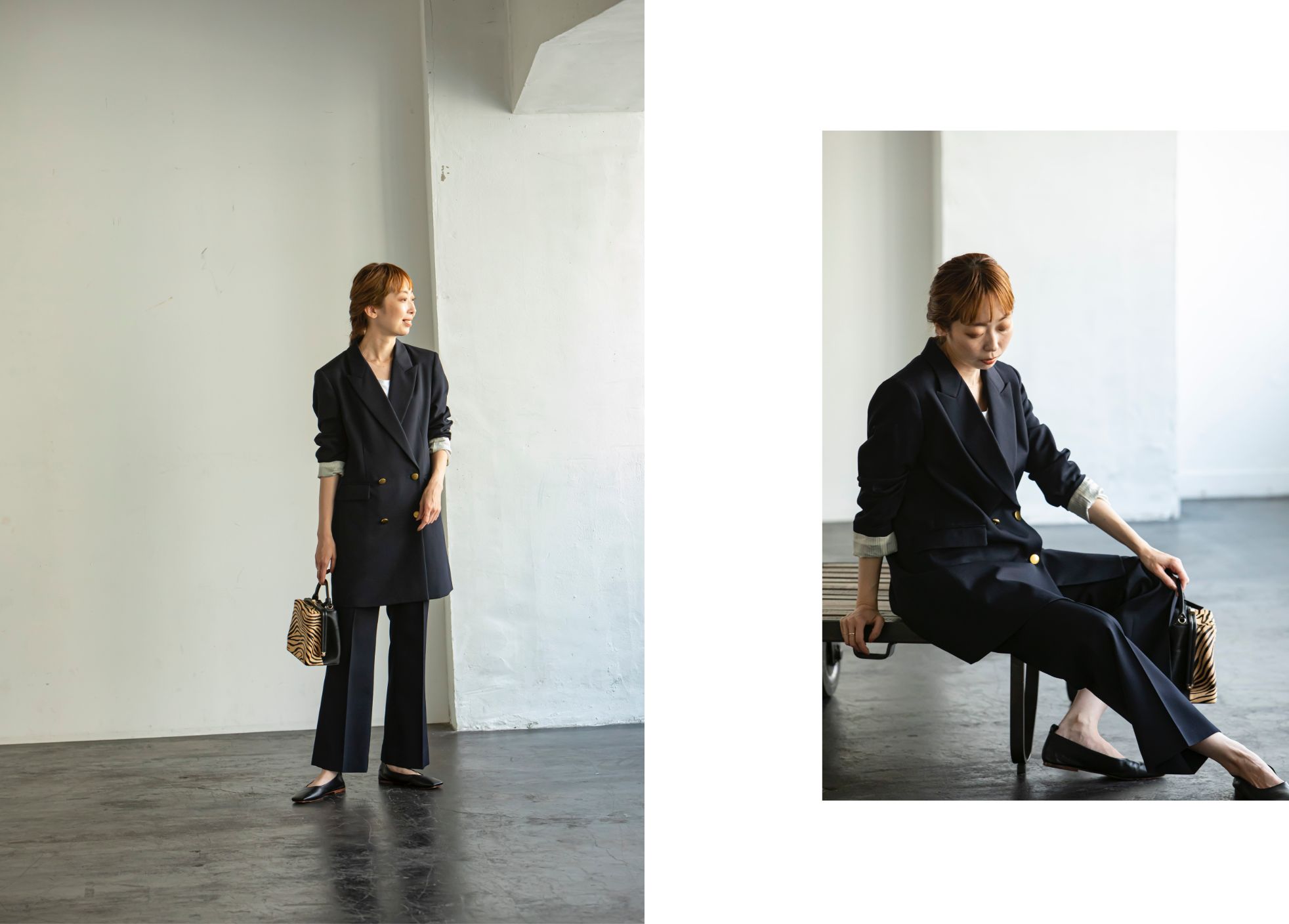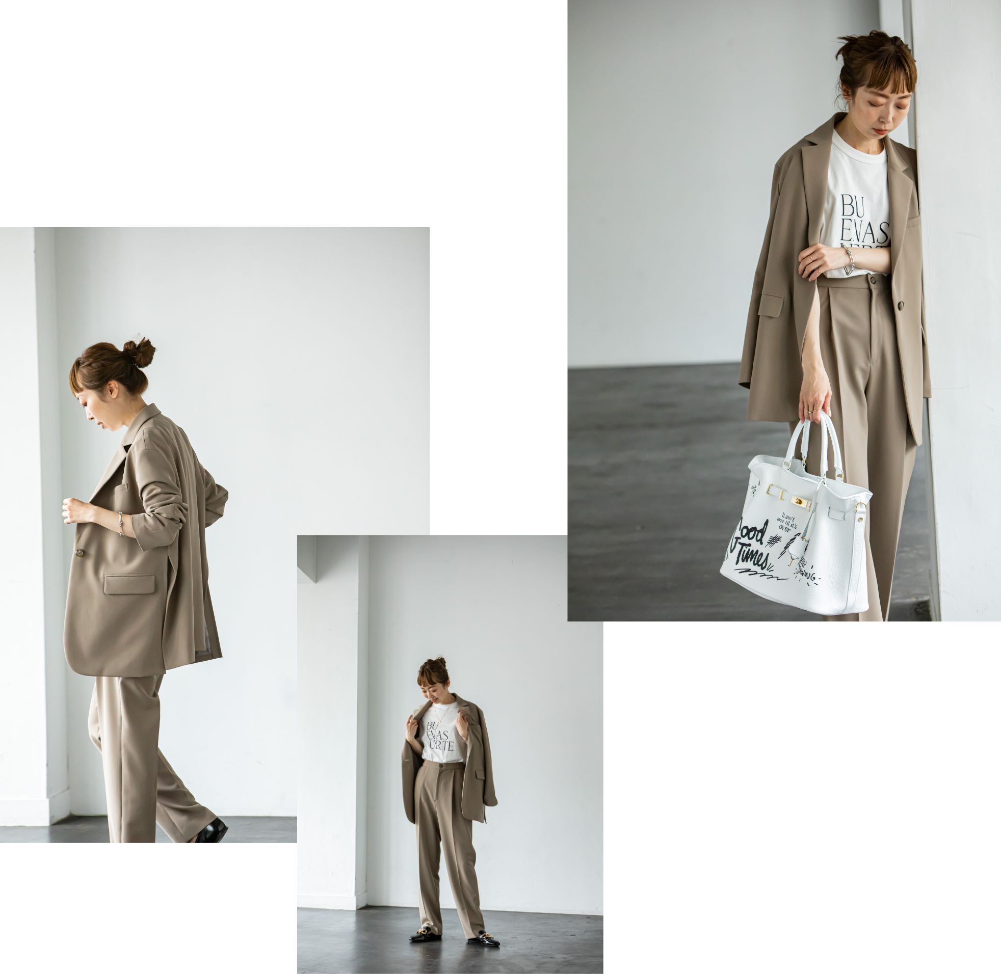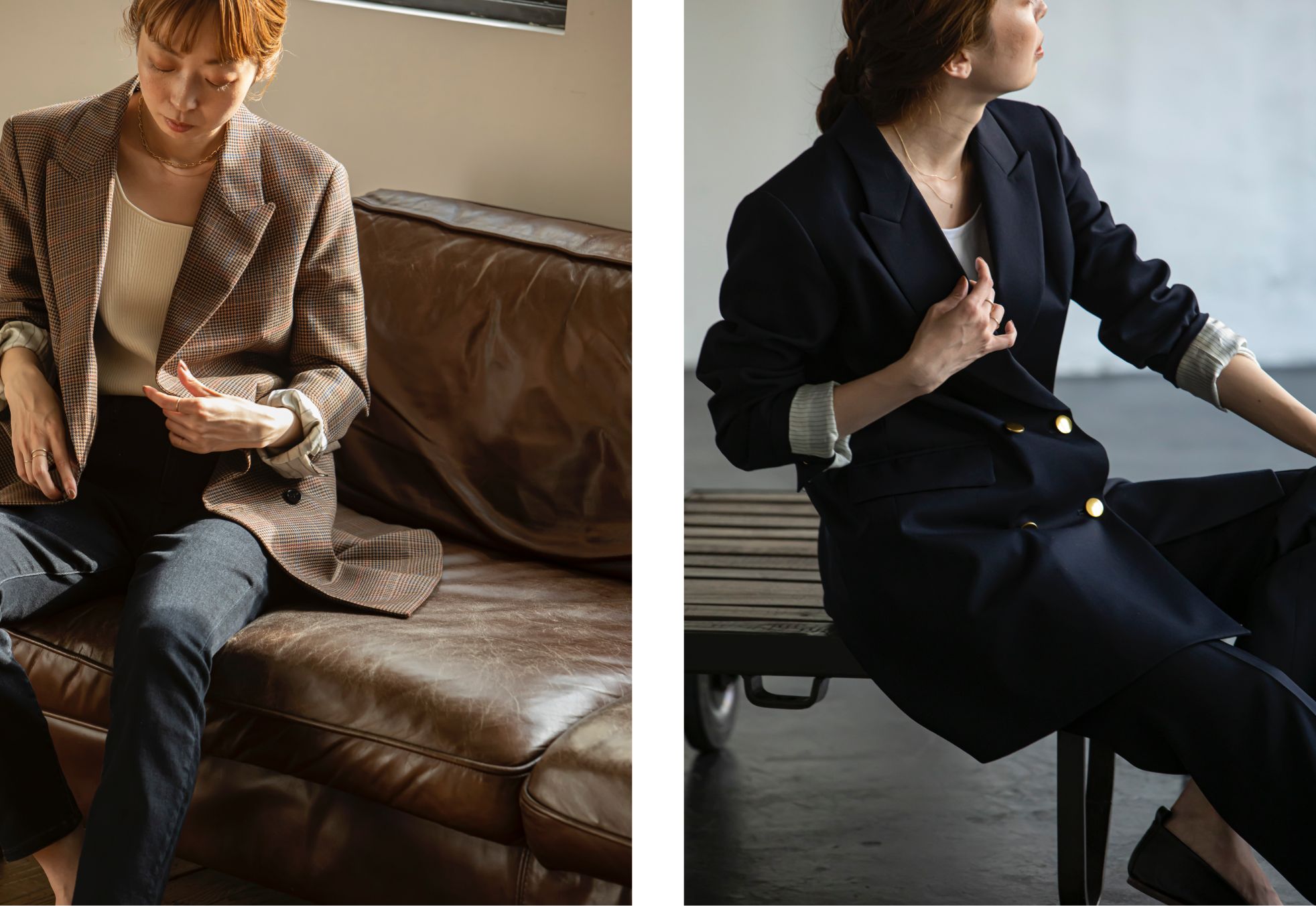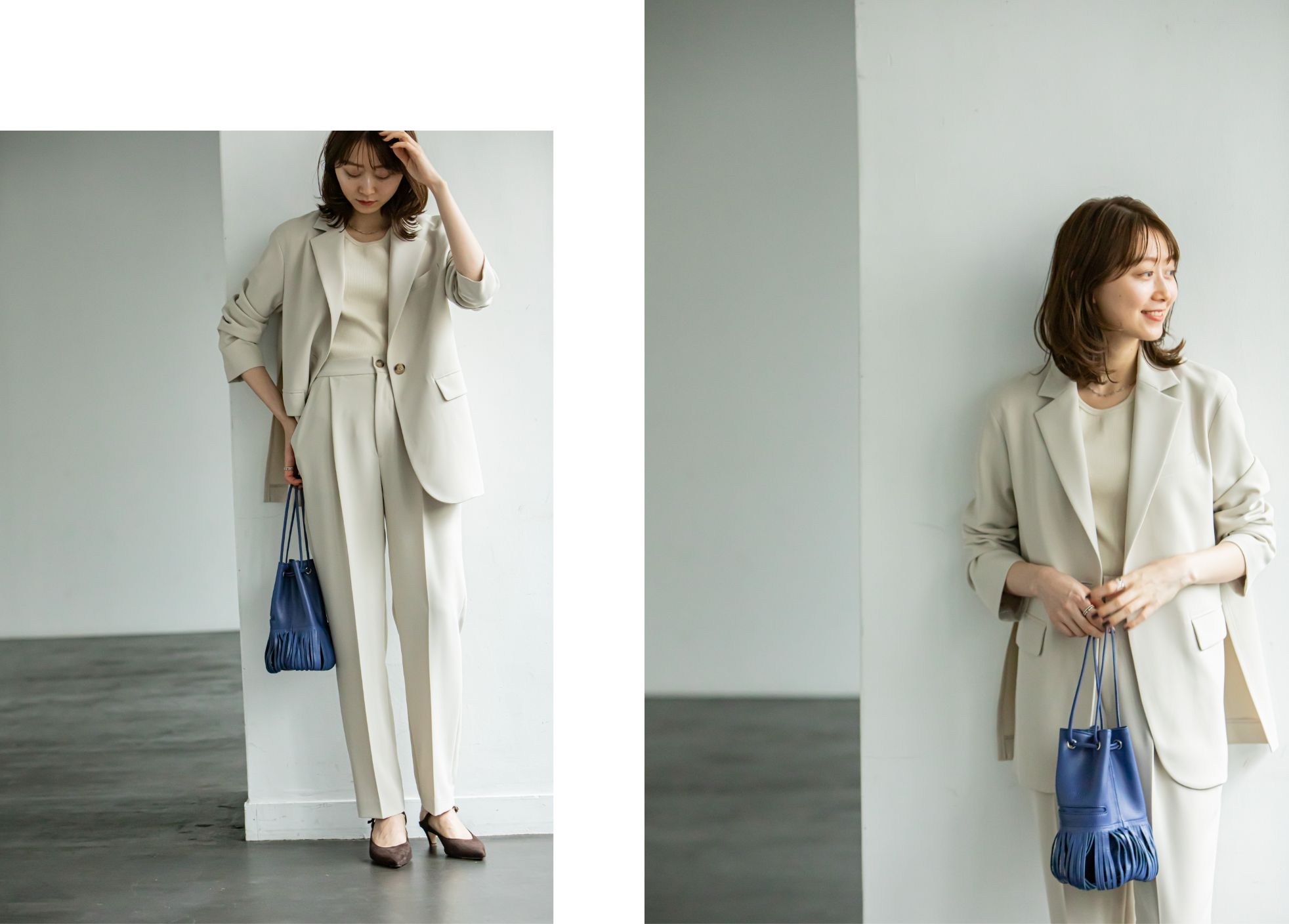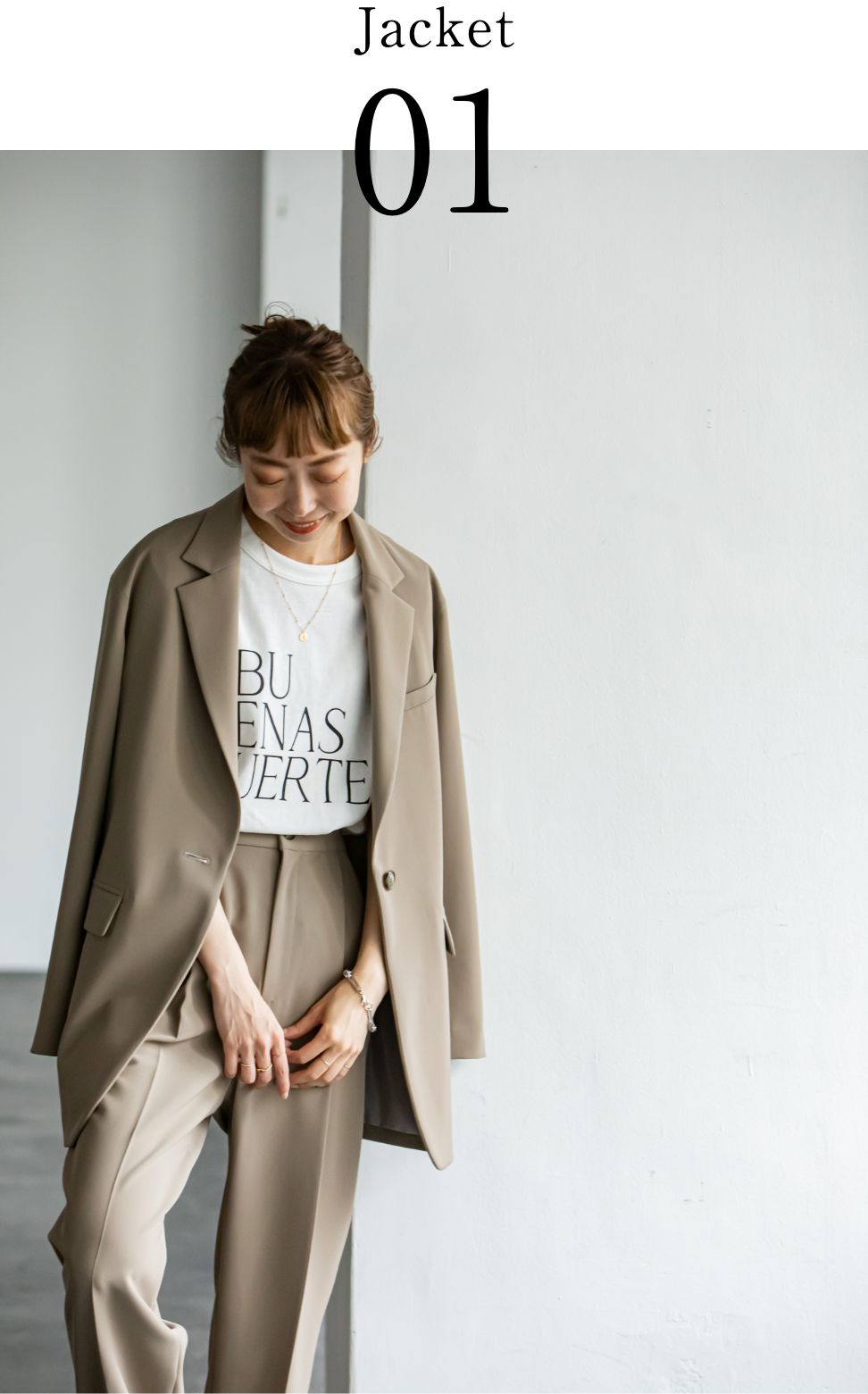・シリーズのパンツと合わせれば、トレンドのセットアップスタイルに- NOBLEエステルソフトカルゼロングスリットジャケット◆¥26,400(税込)
